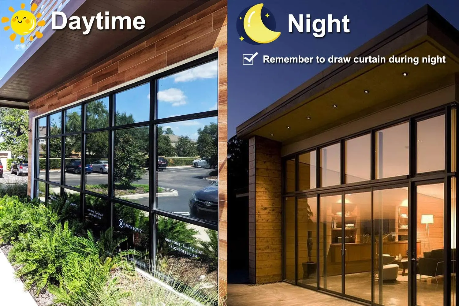 3. Различные эффекты между днем и ночью: Внешнее стекло покажет зеркальный эффект, а также Сохраняйте конфиденциальность в дневное время (Если люди снаружи, которые находятся рядом, они не полностью невидимы изнутри). Ночью наружное стекло потеряет зеркальный эффект, и люди снаружи могут видеть внутри. Поэтому, Занавески необходимы ночью.