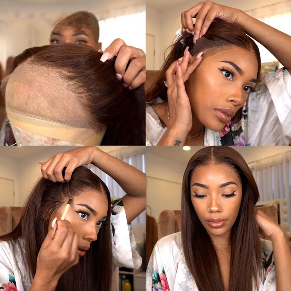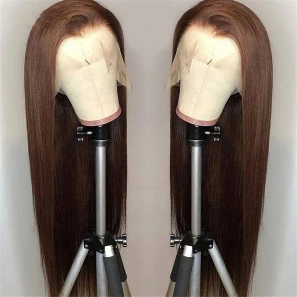 Парики женские синтетические, шоколадно-коричневые шелковистые прямые на сетке спереди, с предварительно выщипанной линией волос