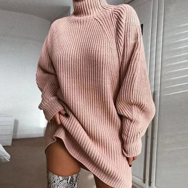 Женское трикотажное платье-свитер с высоким воротником, с длинным рукавом