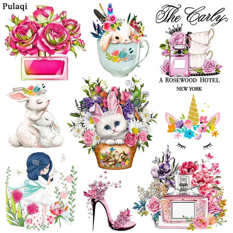 Термонаклейки для одежды с изображением цветов духов, мультяшных животных, утюжок для переноса одежды, термоклейкие патчи с аппликацией