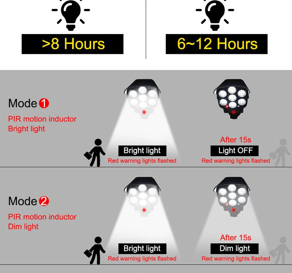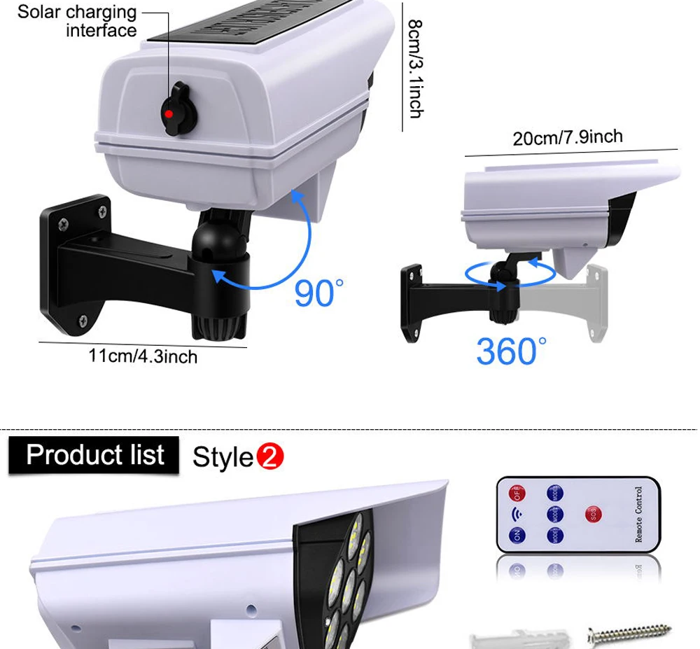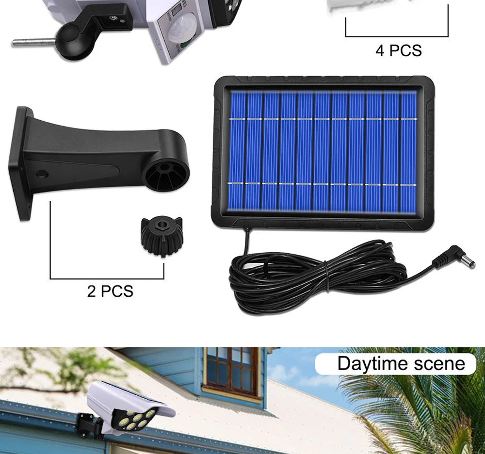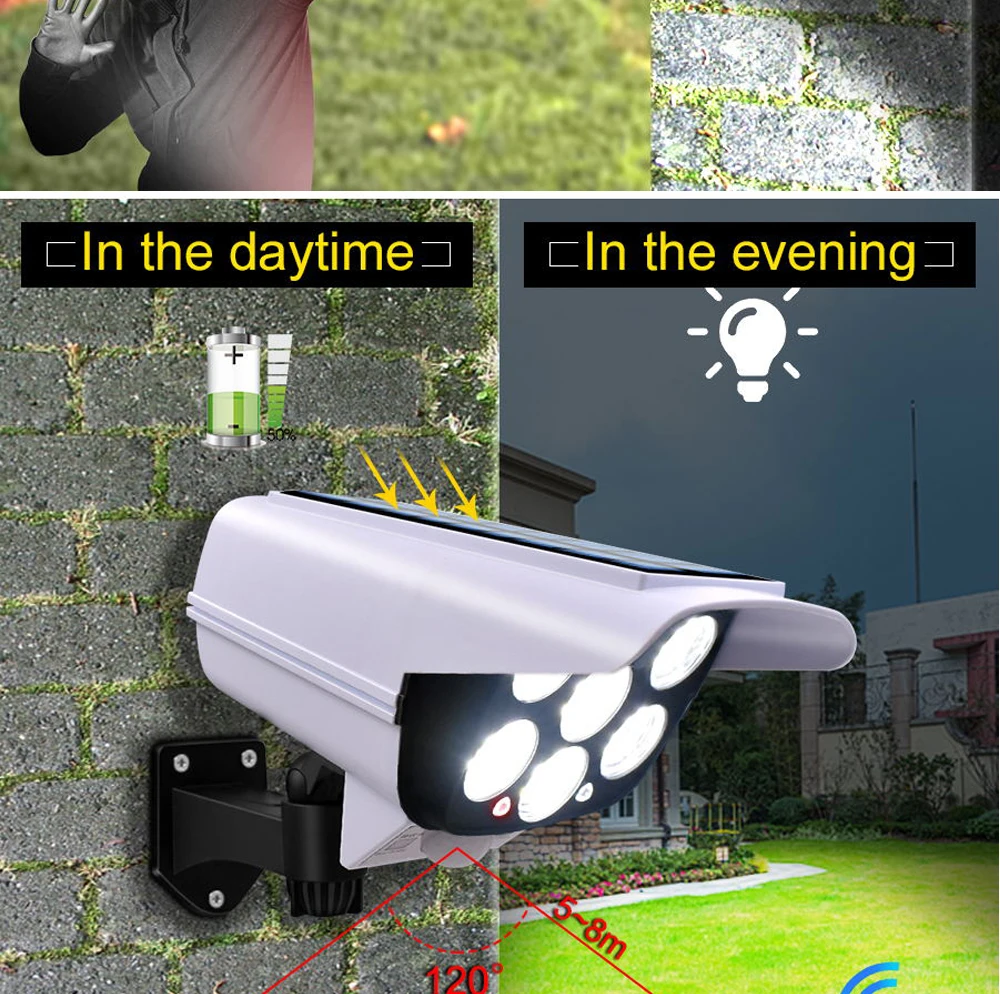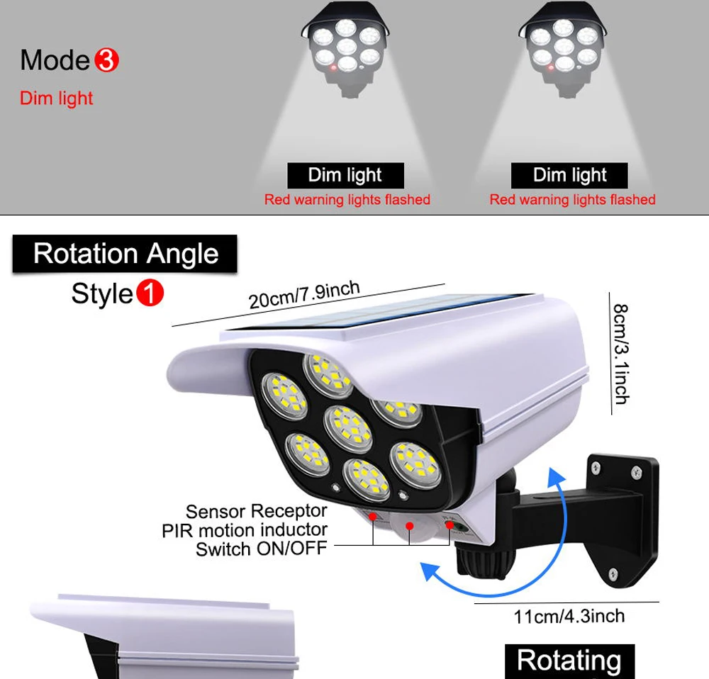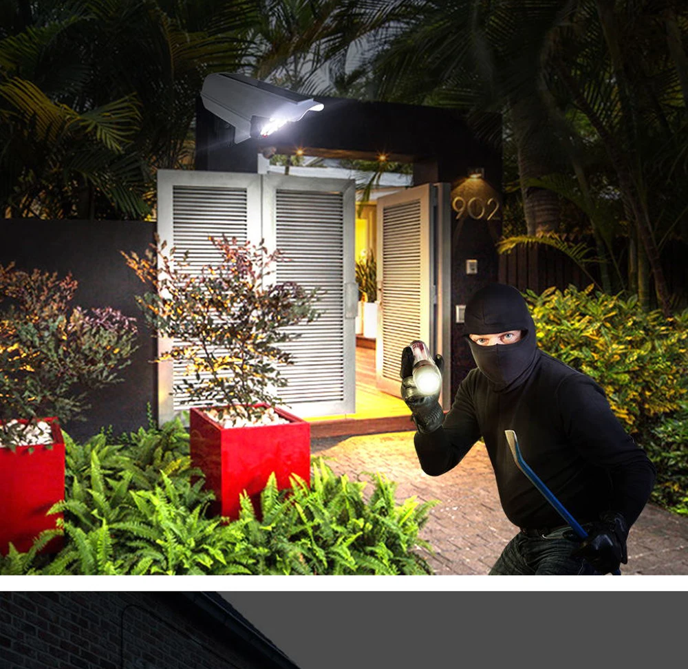 Солнечный светильник с датчиком движения муляж системы безопасности камера беспроводной наружный прожектор светильник IP65 Водонепроницаемый 77 светодиодный светильник 3 режима для дома и садаОсобенности:▪【 2 в 1 солнечный светильник и муляж системы безопасности камеры-Держите вашу домашнюю собственность в безопасности и охранников. С 77 яркими светодиодами, активированным движением, гладким низкопрофильным дизайном. Плюс Реалистичная камера безопасности. Обнаружение нарушителей держаться подальше от вашего дома▪【3 светильник режим ing опционально 】- ① светильник выключается ночью, просто красный светильник мигает, сильный светильник включается при обнаружении движения; ② слабый светильник в ночное время, сильный светильник включается при обнаружении движения; ③ всегда светильник в режиме, красный светильник всегда мигает в любом режиме▪【Долгое время работы с батареей 】-светильник безопасности с батареей 2400 мАч может обеспечить до 8 часов использования времени, дополнительная солнечная панель для простой установки без проводов и поглощает солнечную энергию под солнечный светильник, охрана окружающей среды и энергосбережение▪【 Встроенный датчик движения PIR-светильник автоматически срабатывает при обнаружении движения на расстоянии 10-30 футов, в диапазоне 120 градусов в ночное время. Идеально подходит для сада двора лужайки патио гаража крыльца подъездной дорожки ландшафтной безопасности. Сделайте вашу жизнь более удобной▪【Регулируемый и простой в установке 】-солнечный светильник довольно легко устанавливается. И вращение может регулировать оптимальный угол освещения и угол солнечной панели с легким, IP65 Водонепроницаемый идеально подходит для наружного использованияСпецификация:-Батарея: 18650 2400 мАч литиевая батарея-- 77led/2835 SMD белый светильник + 1 светодиодный красный светильник-Солнечная панель: 5,5 v/300mAh-- Материал: АБС-пластик-- Водонепроницаемый: IP65