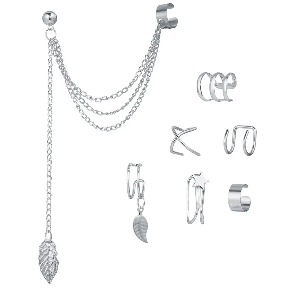 Серьги-клипсы женские без пирсинга, модные украшения для ушей с листьями золотистой звезды, простые Поддельные Украшения для ушей, каффы, 7 шт., аксессуары