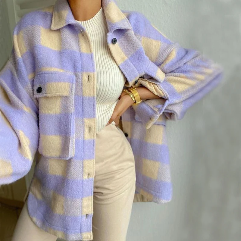 Женская клетчатая куртка на пуговицах, фиолетовая безразмерная куртка в клетку с воротником и карманами, в стиле K-POP, большие размеры, 2022