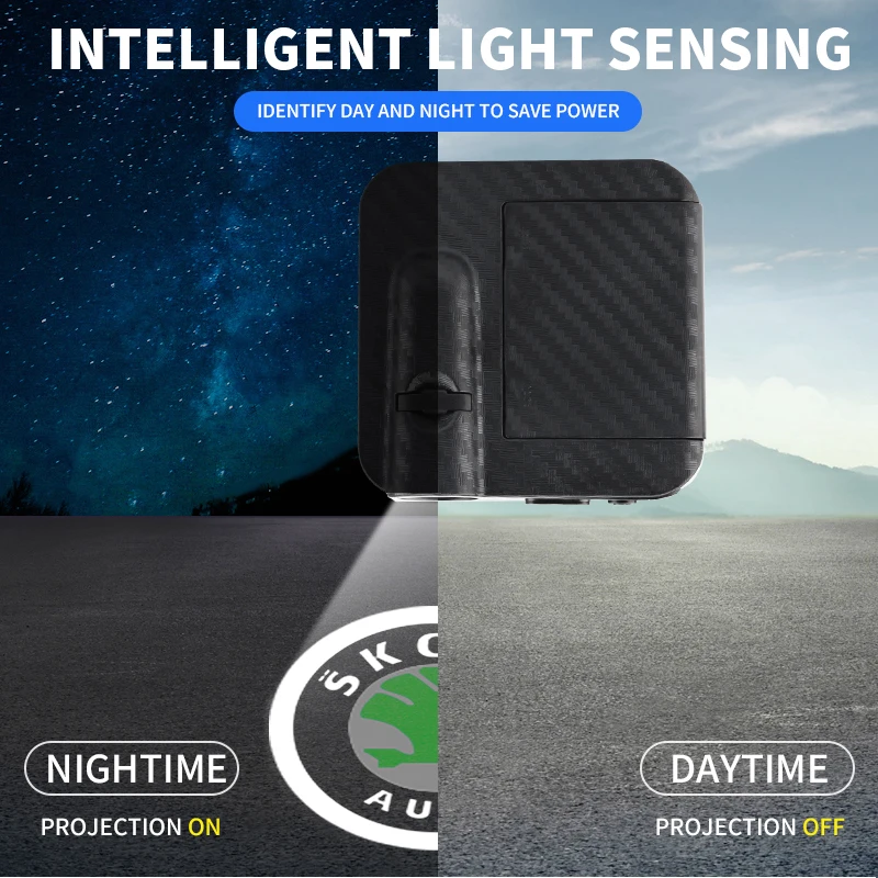 2. Умный светильник. Ослепляющий светильник с логотипом и сигнальный светильник будут отображаться на земле, когда вы откроете дверь автомобиля, и он выключится, когда вы закроете дверь.