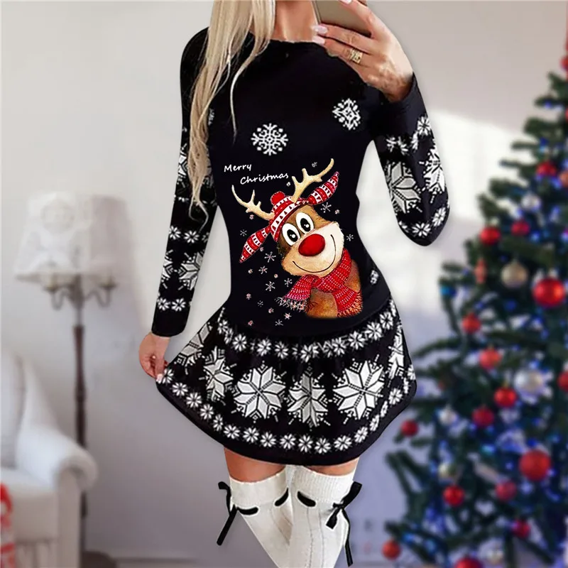 Рождественское праздвечерние чное платье на новый год 2022 с мультяшным принтом животных, платье женское модные повседневные платья, осенне-зимнее сексуальное облегающее платье с круглым вырезом и длинным рукавом