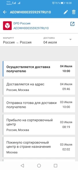 Я когда заказывала написано было 3 июля доставка будет а потом доставка 1 июля написано было а пришли мне 4 июля сегодня курьер принёс 20-00 часов вечера а позвонил мне 17:00 часов дня! До курьера не возможное дозвониться! Занят бросает трубку! DPD ОЧЕНЬ ПЛОХАЯ ДОСТАВКА ПОСЫЛОК И ТОВАРОВ ИЗ КИТАЯ ПО РОССИИ!очень ужасное доставка и то не вовремя а за доставку оплатила как было сколько и платила! Не бесплатно было доставка! И то курьер не вежлив! Не пунктуален!начало заказа было обман и то до конца и было ложью! Не пробовала ещё не пробовала но не заряженный аппарат.