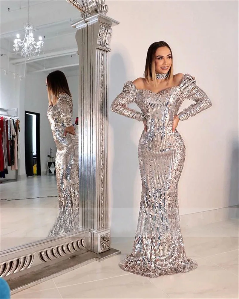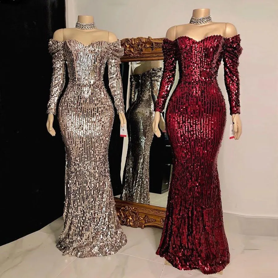 Сексуальные блестящие Длинные вечерние платья с открытыми плечами и юбкой-годе, 2022, платье для выпускного вечера с длинным рукавом в африканском стиле, для вечеринки и ночи