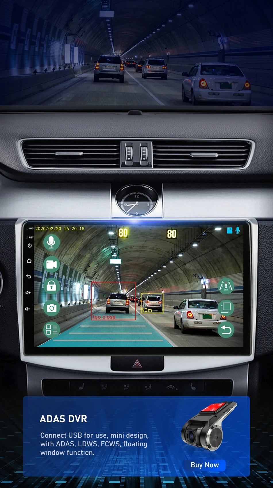 Поддерживает подключение к видеорегистраторУ ADAS. ADAS DVR имеет несколько встроенных ассистивных технологий вождения, вставляя высококачественную карту памяти TF для записи каждого момента вашего вождения.