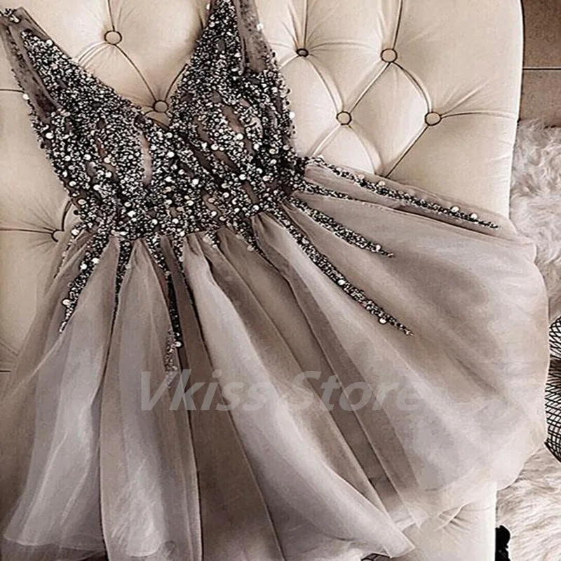 Серые Коктейльные платья с V-образным вырезом, блестками и бисером, короткие платья из тюля для выпускного вечера, Роскошные платья, женское платье для выпускного вечера