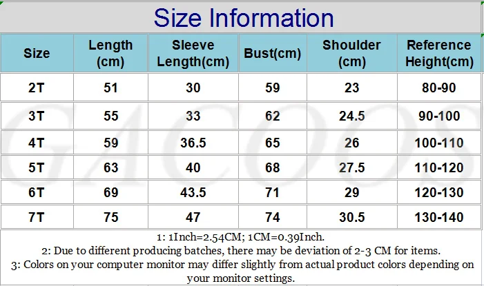 1 дюйм = 2,54 см; 1 см = 0,39 дюймов.1. Если ваш ребенок пухленький, мы рекомендуем выбрать больший размер. Пожалуйста, обратитесь к вашим детямРост и Таблица размеровПеред покупкой/торгами. Спасибо.