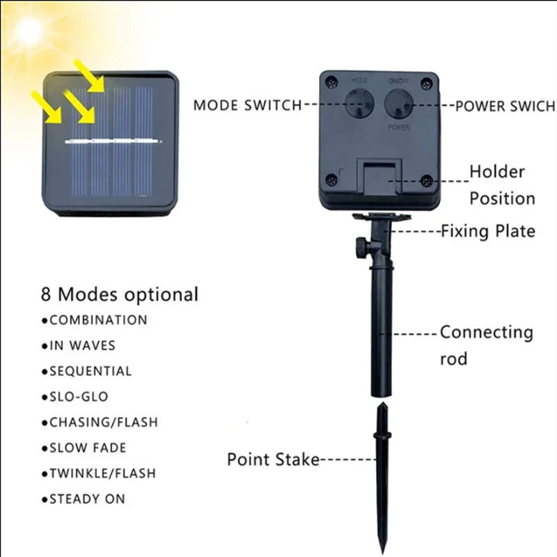 Особенности:1. Гирлянда на солнечных батареях, без затрат на электроэнергию.2. Поместите под Солнечный свет в течение дня, и он начинает светильник ночью.3. IP65 водонепроницаемый, идеально подходит для украшения вашего сада, патио, двора.4. Наденьте на стену, окно, дверь, пол, потолок, траву, рождественскую елку, почту или здание, добавив идеальную атмосферу в ваше место5. Умный светильник с датчиком. Автоматически включается в сумерках и выключается на рассвете.Характеристики:Степень защиты: IP65Материал: пластикВремя зарядки: 6-8 часовВремя работы: 8-10 часовПереключатель: включение/выключение питания и режим вспышкиПанели солнечные: 2В 170mAАккумулятор: AA, аккумулятор Ni-MH емкостью 800 мА · ч, длина 1 шт. от солнечной панели до первой доли: 2 мДлина между двумя светильник: 30 смМуша Места Размеры: 4,5 см x (3,6 см + 18 см)8 режимов освещения1. Постоянный светильник2. Волновая форма3. Непрерывный4. Мигающий5. Медленное мигание6. Яркий и темный7. Мечтательный8. Быстрое мигание