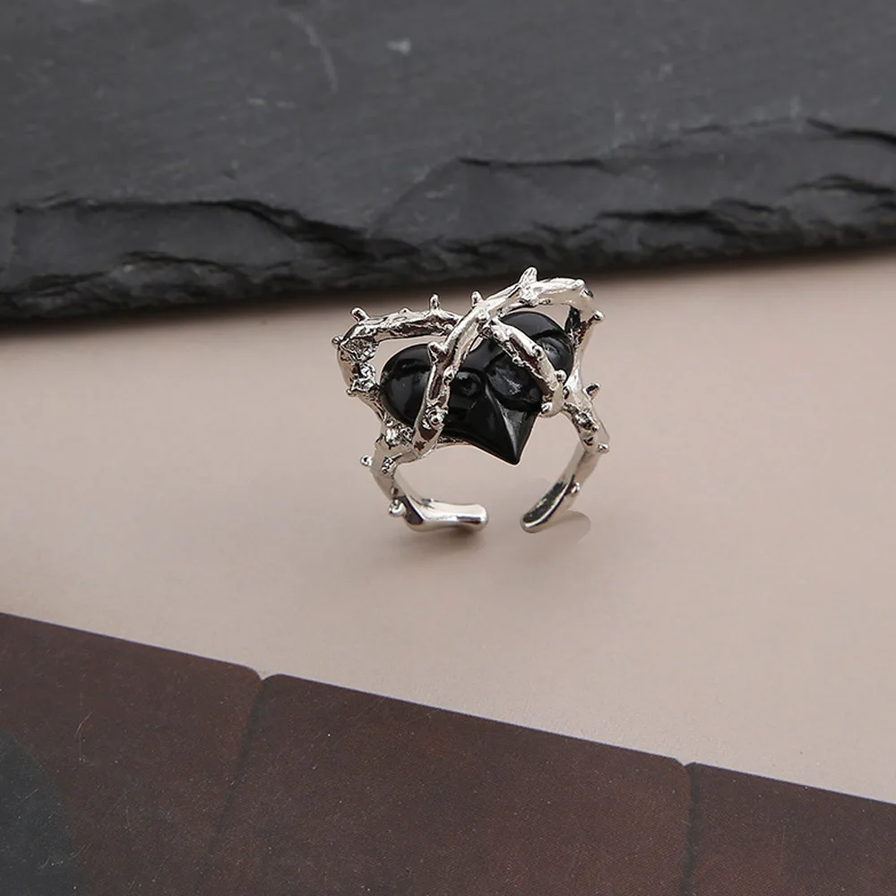 Винтажные открытые кольца в стиле панк с черным сердцем, серебряное кольцо неправильной формы для пар, готическое регулируемое ювелирное изделие для женщин и мужчин