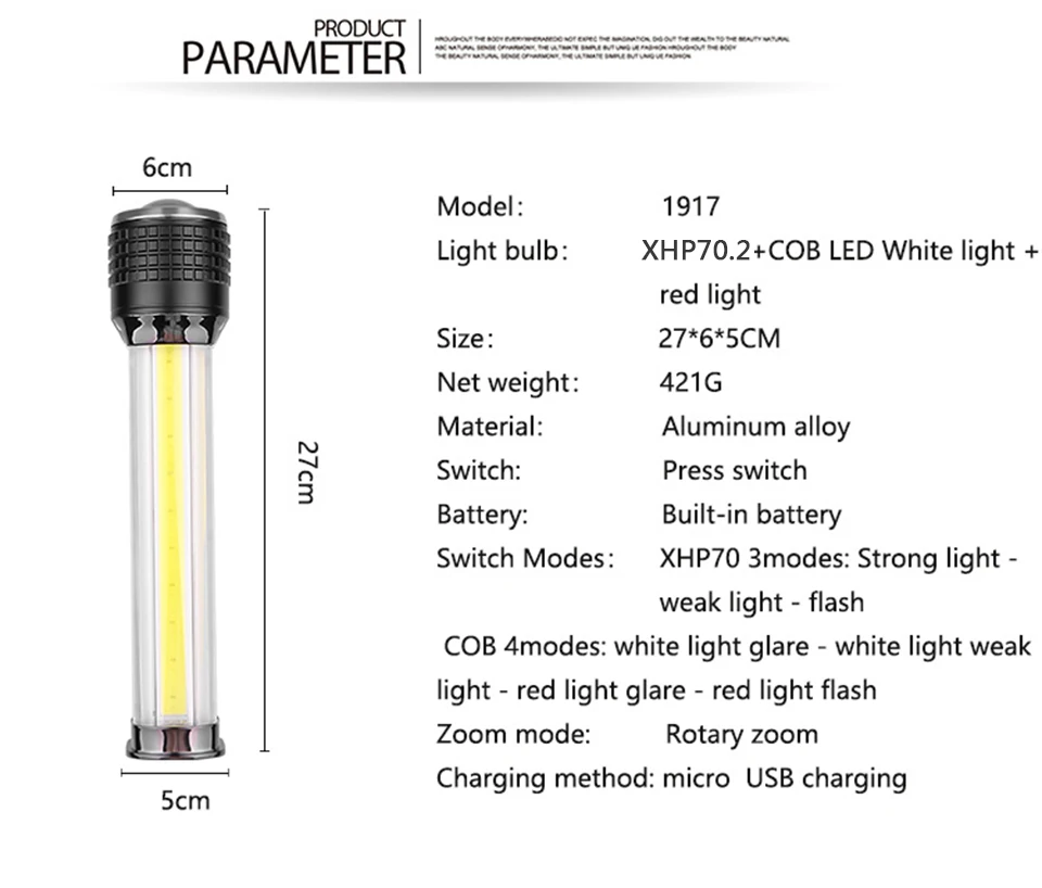 Нажмите переключатель 3 секунды для включения COB led ( 4 режима COB белый светильник высокий-COB белый светильник Низкий-COB красный светильник вспышка)