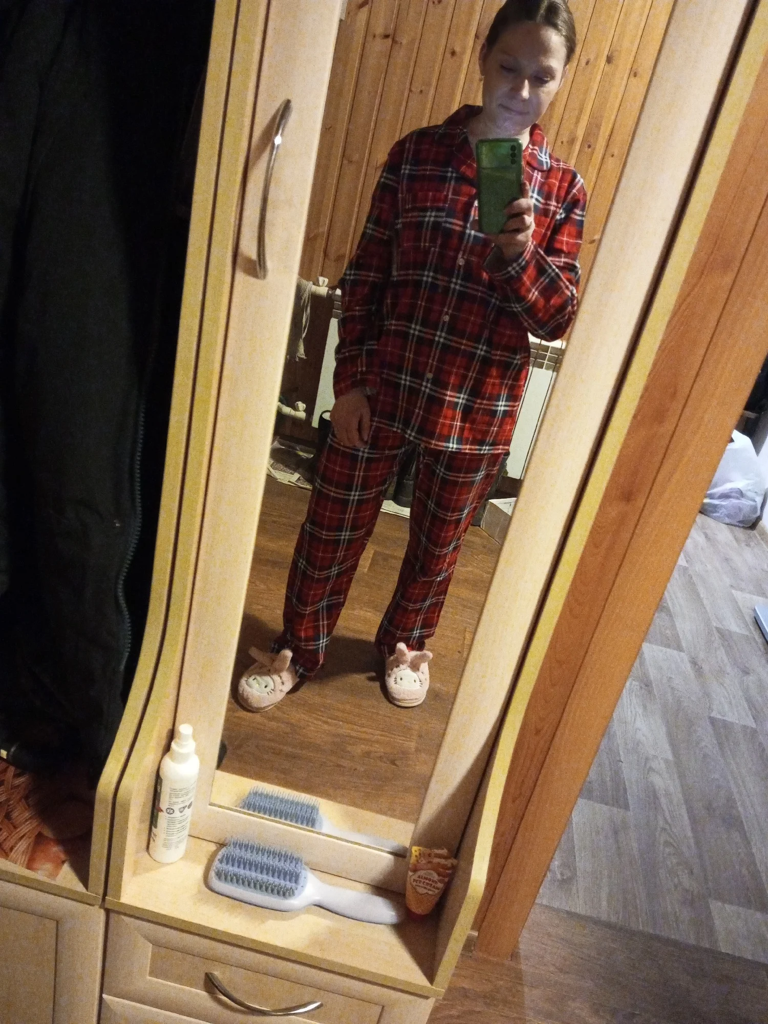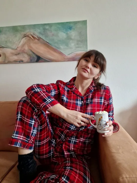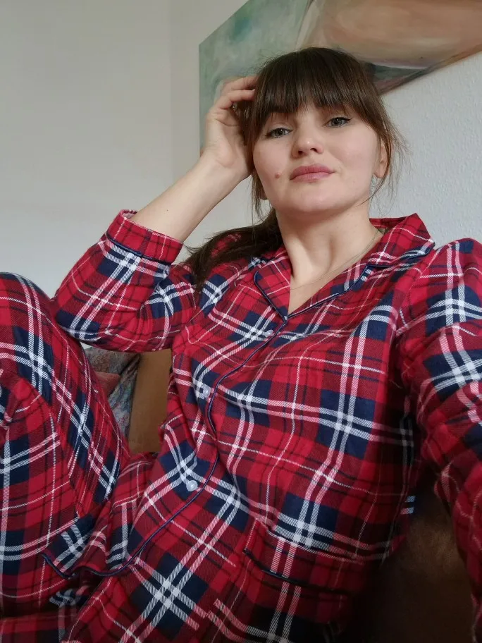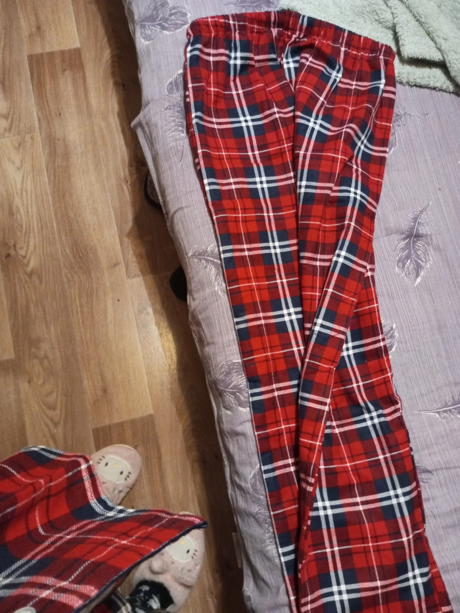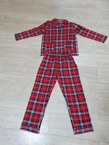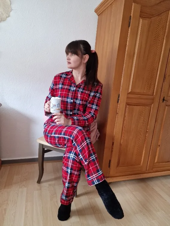 Ткань - настоящая фланелька. Но не сходится по размеру верх с низом. Мой размер - 48. Штаны сели удобно, свободно, не в обтяг, как и должны сидеть штанишки от пижамы. А вот рубашка, как минимум на размер 52-54, смотрится громоздко, буду ушивать.