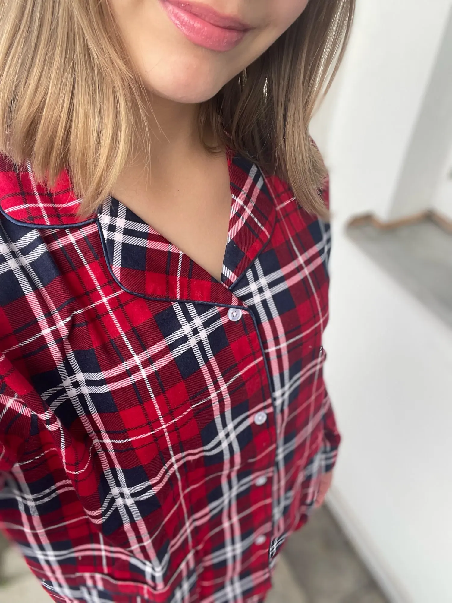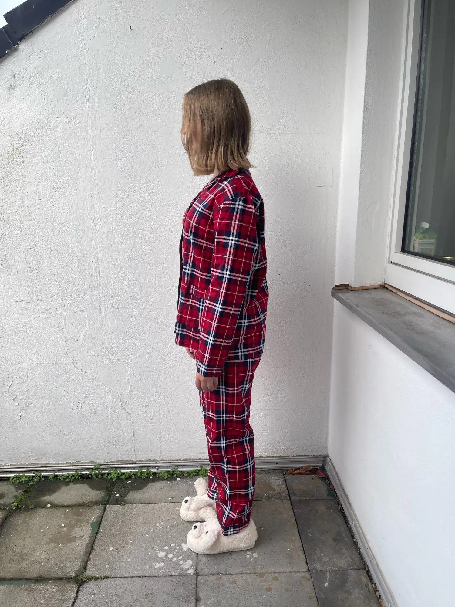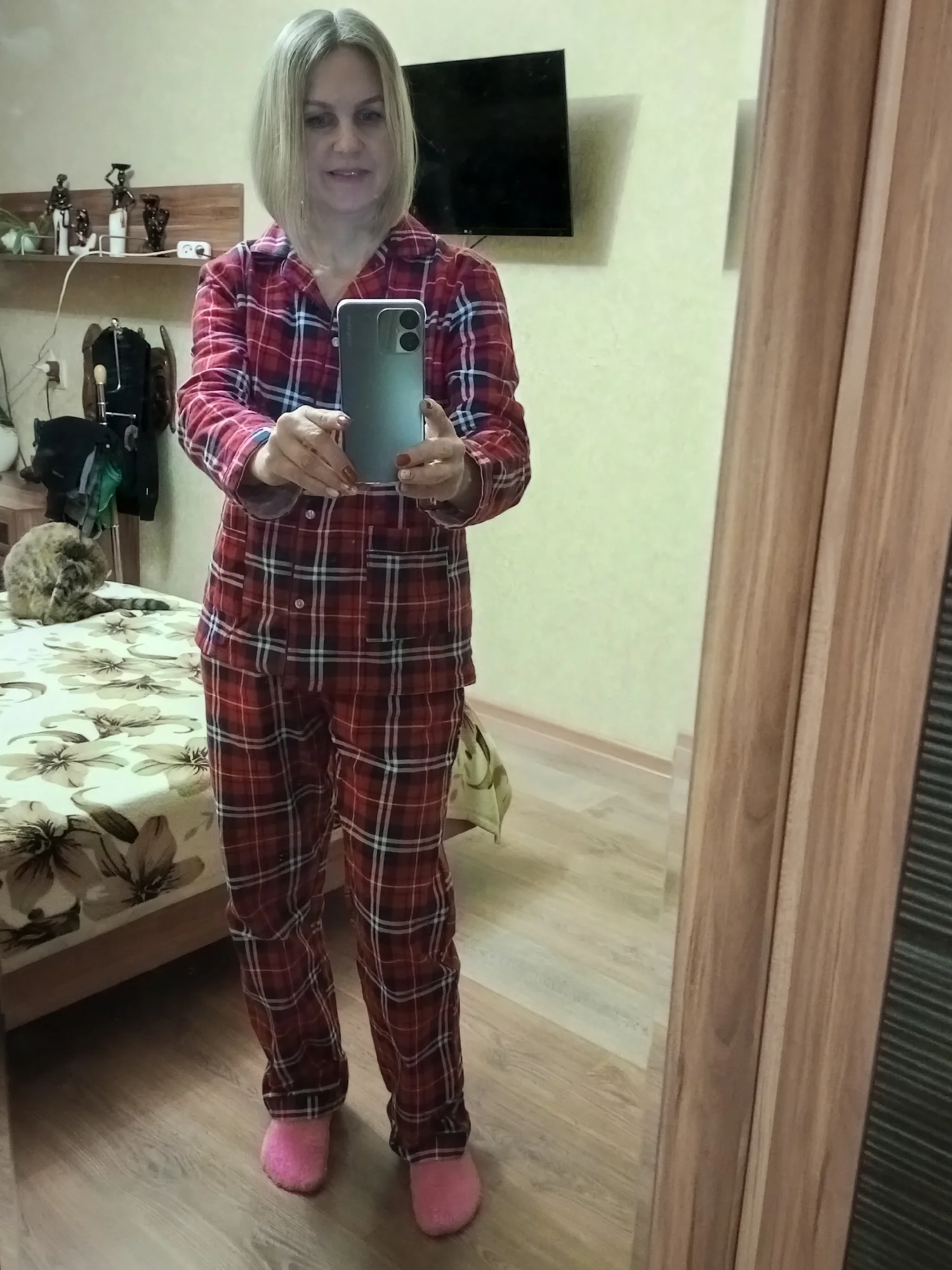 Ткань - настоящая фланелька. Но не сходится по размеру верх с низом. Мой размер - 48. Штаны сели удобно, свободно, не в обтяг, как и должны сидеть штанишки от пижамы. А вот рубашка, как минимум на размер 52-54, смотрится громоздко, буду ушивать.