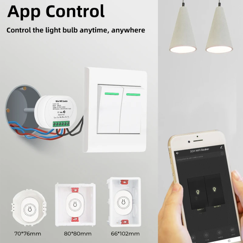 Умный модуль переключателя Wi-Fi 2 банды может быть установлен за кассетой переключателя для управления переключателем 2 банд или управления лампами 2 светильник. Он поддерживает два способа одновременно, поворачивая неумные лампочки или Переключая их в интеллектуальное управление, обеспечивая включение и выключение управления, синхронизацию и Голосовое управление (Alexa, Google assistant) и обмен данными, функции группового контроля. В то же время, он также может создавать умные сцены с другими смарт-устройствами в приложении для достижения связи сцены. (Приложение: Smart Life/Tuya smart)