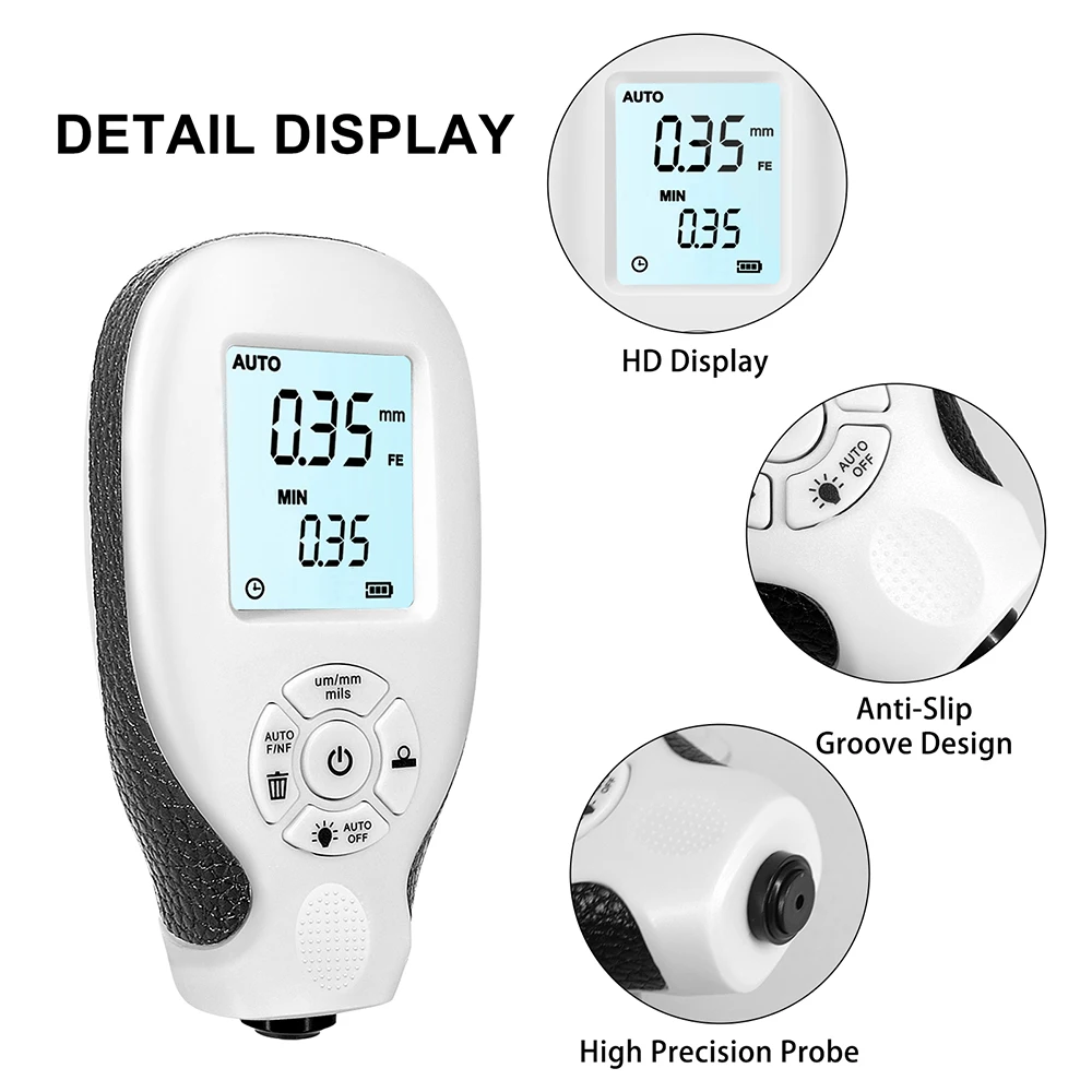Автоматическое отключение экономит электричество три режима измерения: одно измерение, непрерывное измерение и дифференциальное измерение подходит для измерения покрытий на железных, алюминиевых и цинковых метрических и имперских единицах.