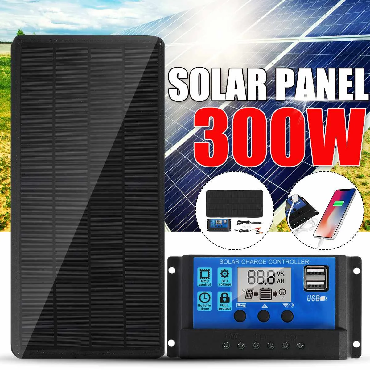 Солнечная панель 300 Вт, 18 в, солнечная батарея 10-50 А, контролле...