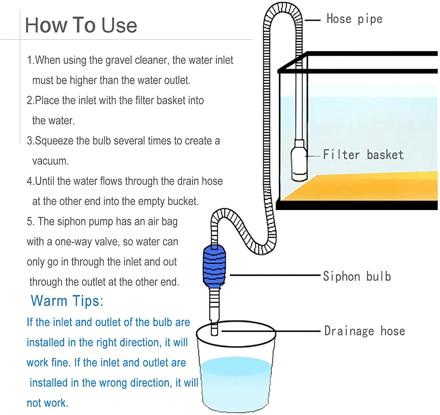 [Безопасный и прочный] очиститель аквариума vacuum'inlet имеет фильтр-корзину, предназначенную для использования гравитации, чтобы легко погружаться в воду, не будет беспокоить рыбу или декор, когда щебень вакуум для аквариума работает. Трубка изготовлена из утолщенных экологически чистых материалов. Лампа обладает хорошей устойчивостью к экструзии и используется для длительного использования. Подходит для небольших резервуаров