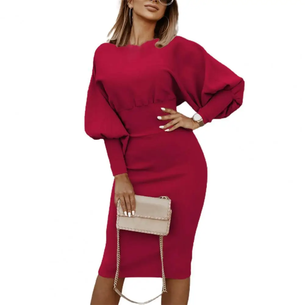 Женское облегающее офисное платье с пышными рукавами, круглым вырезом и длиной до колена, базовое элеганвечерние вечернее платье