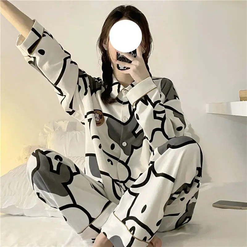 Пижама с коровьим принтом, комплект из двух предметов, осенняя Пижама, Женская хлопковая Милая Домашняя одежда, пижамы, одежда для сна в японском стиле, Kawaii