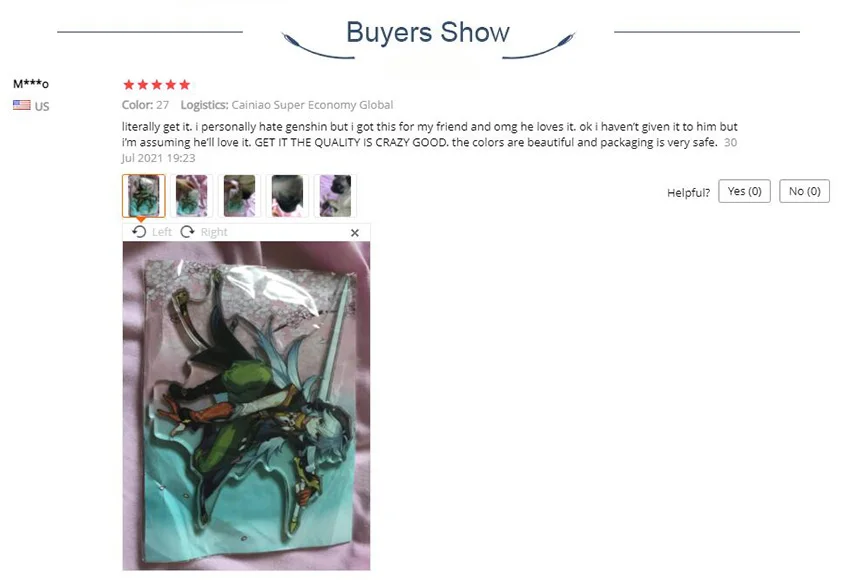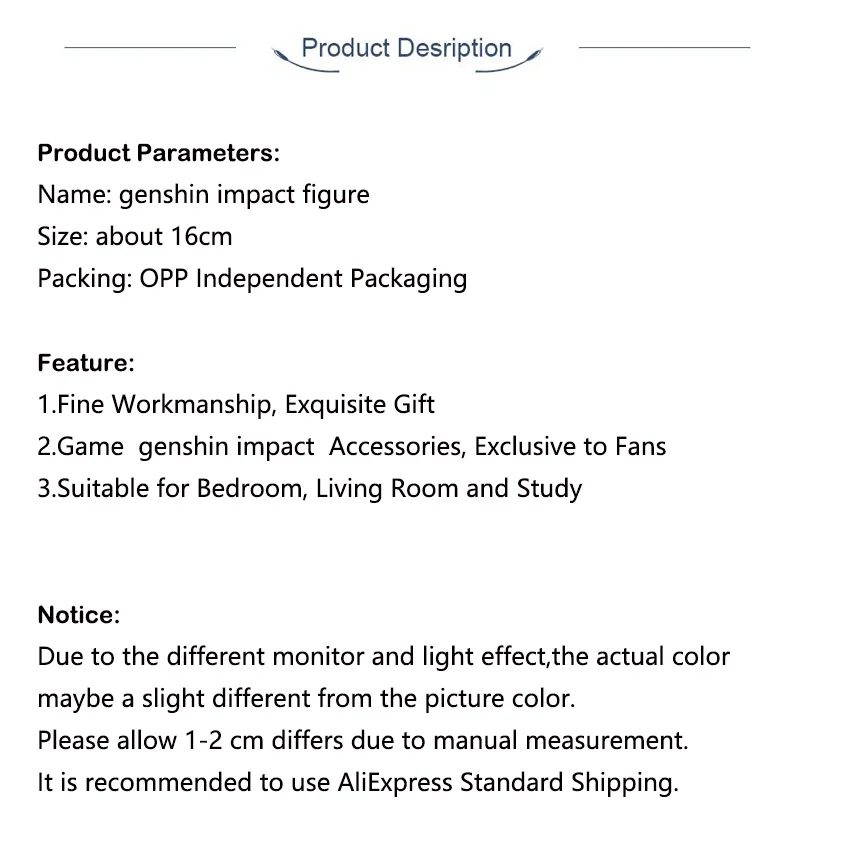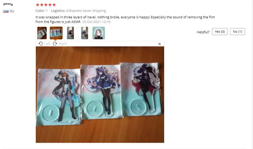 брала рандом и приехал дилюк)) очень довольна качеством фигурки.дефектов нет(разве что на подставке чутка рисунок содрался,но это не видно(на фото еле видно)).также приехало очень быстро (7 января оплатила и 24 января заказ был уже в моём городе) очень рекомендую:) большое спасибо продавцу за качество,цену и скорость