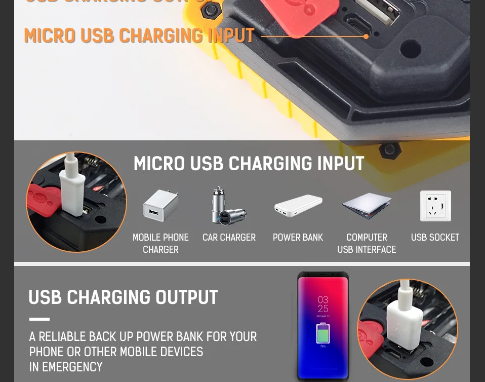 1. Функция Power Bank-Разработанный usb-вход и выход, удобно заряжать ваш мобильный телефон в любое время. Может служить резервным зарядным устройством для вашего телефона или других мобильных устройств в чрезвычайной ситуации.2. Удобный и гибкость: беспроводной COB светодиодный рабочий свет с прочный 180 градусов вращения регулируемая ручка, вы можете Опора его легко двигаться во время и поместить его в любом месте всего вам нравится. Светодиодный рабочий светильник, висящий на грузовике или ручной.3. Легко переносить или повесить: степень водонепроницаемости IP44, этот светильник идеально подходит для кемпинга, рыбалки, исследования, обслуживания автомобиля или использования в качестве аварийного светильник. Рукоятка с трещинкой удваивается как Регулируемая подставка. Этот светильник легко переносится и может быть расположен, чтобы обеспечить светильник, где он нужен.4. С низким энергопотреблением и более длительный срок службы: экономия энергии до 90% по сравнению с галогенной лампы прожекторов. Использование долговечных супер ярких светодиодов никогда не требует замены. Более чем средняя продолжительность жизни 25000 часов.5. Прочный и долговечный: В отличие от других продуктов, этот прочный прожектор изготовлен из сверхтолстого литого алюминия с теплорассеивающим корпусом и защитой бампера. Он проходит строгий контроль воздействия, вибрации и экстремальных температур перед отправкой в ваш дом.