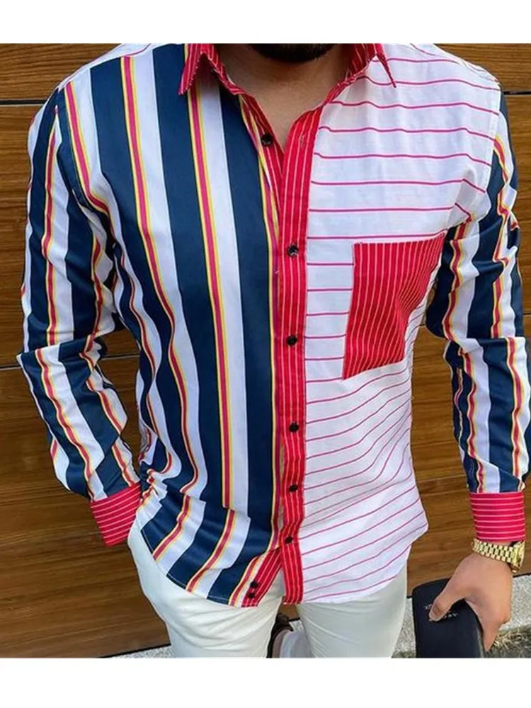Рубашка мужская в полоску, с отворотом, на пуговицах, с длинным рук...