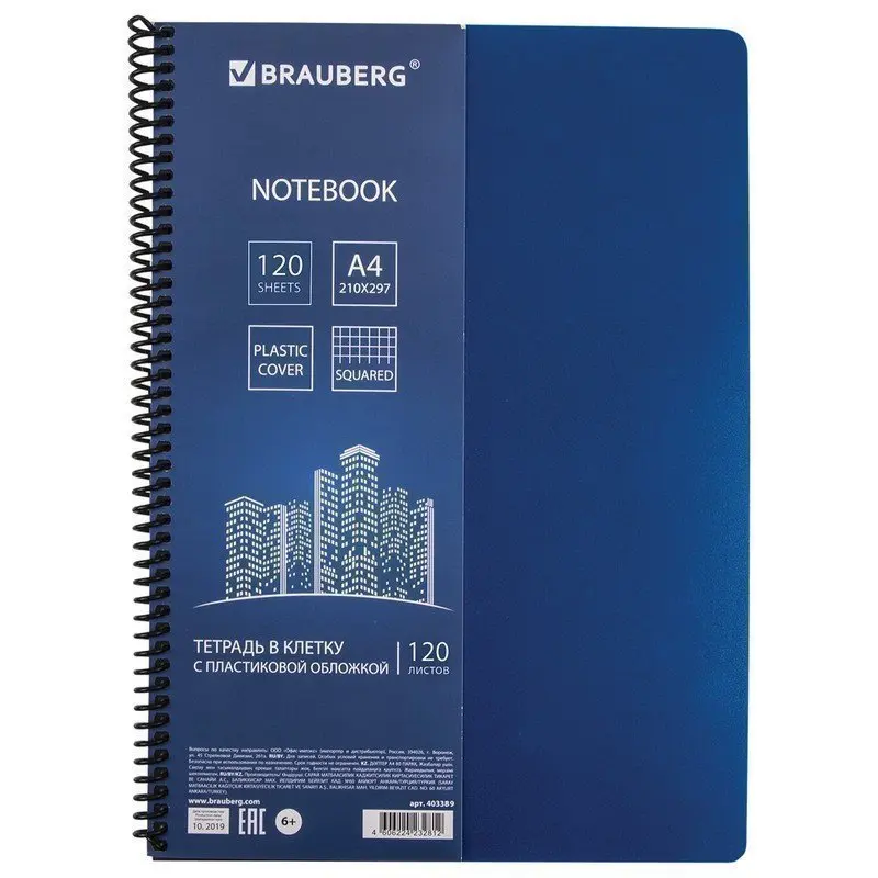 Тетрадь А4, 120 листов, BRAUBERG "Metropolis", спираль пластиковая, клетка, обложка пластик, СИНИЙ, 403389