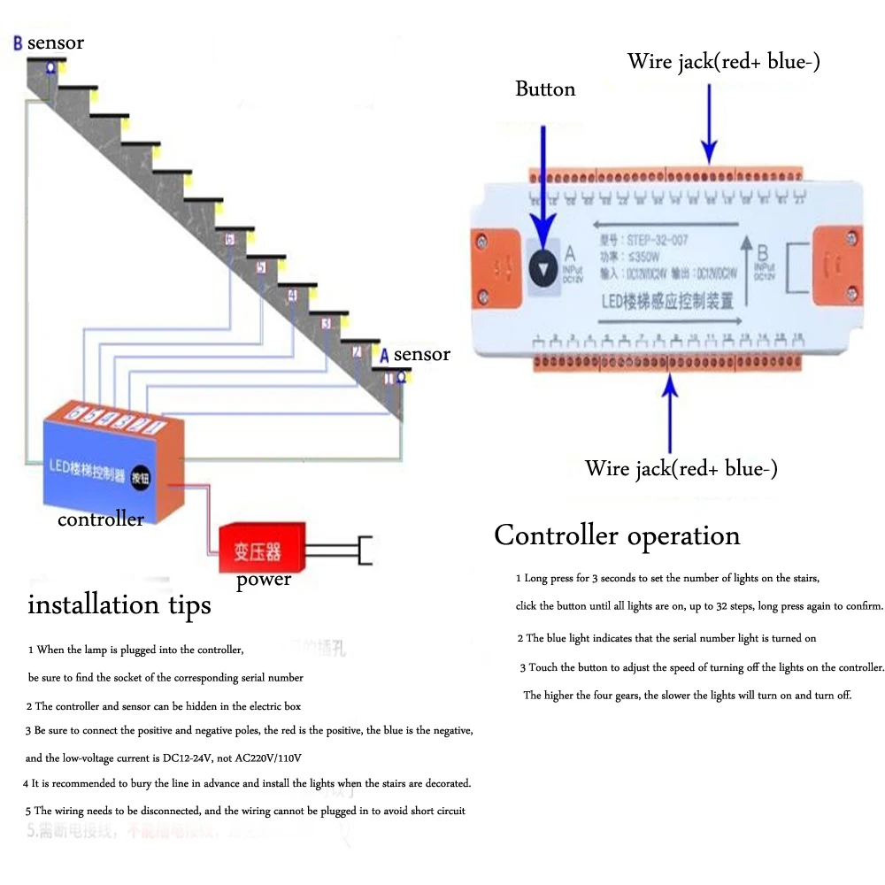 1-A/B датчики должны быть установлены на входе и выходе из лестницы и лицом к телу человека.2-продукт низкого напряжения 12V-24V, подключите к сети питания трансформатор. Не подключайте напрямую 220 В, это сгорит контроллер.3. Изделие не является водонепроницаемым.