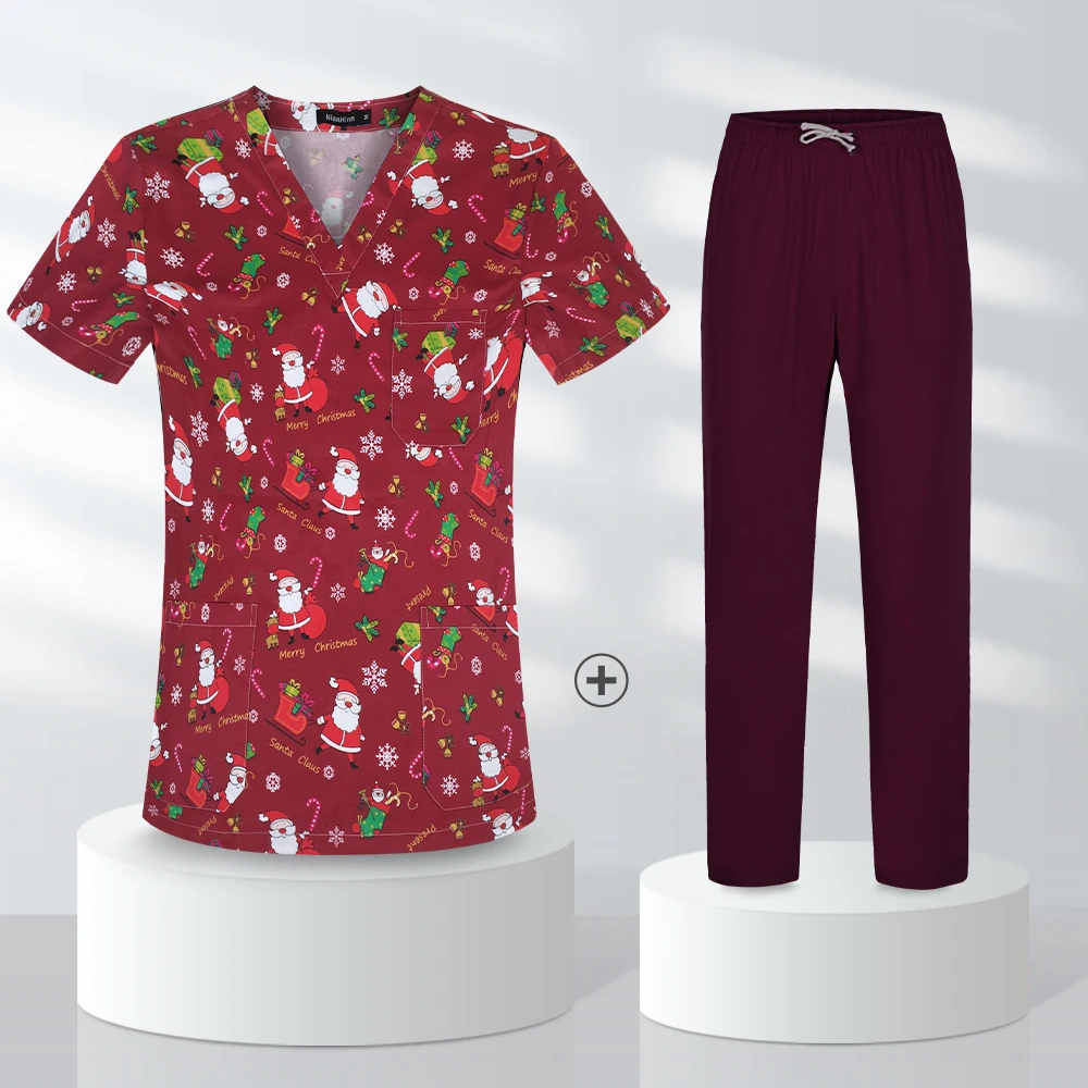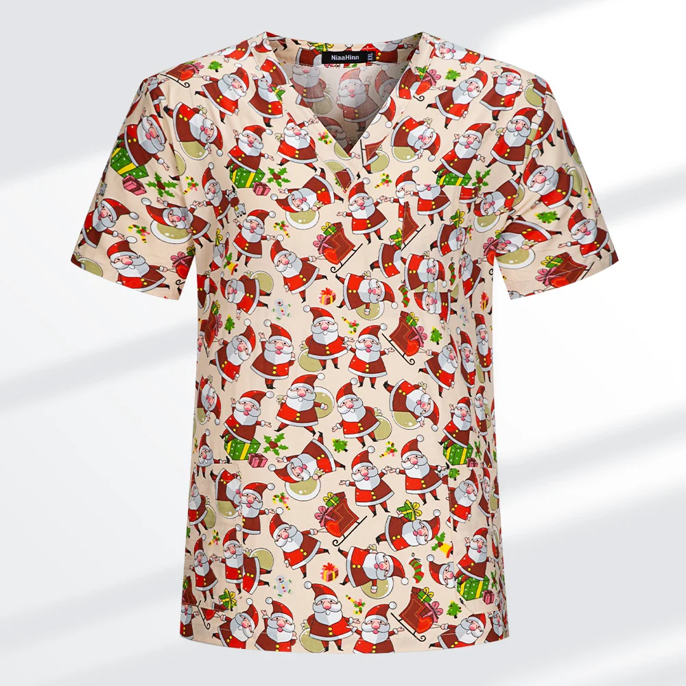 Рождественские печатные скрабы топы с V-образным вырезом Тонкий ветеринарный уход за питомцами с коротким рукавом унисекс мультяшная клиника медицинская Рабочая Униформа медсестры