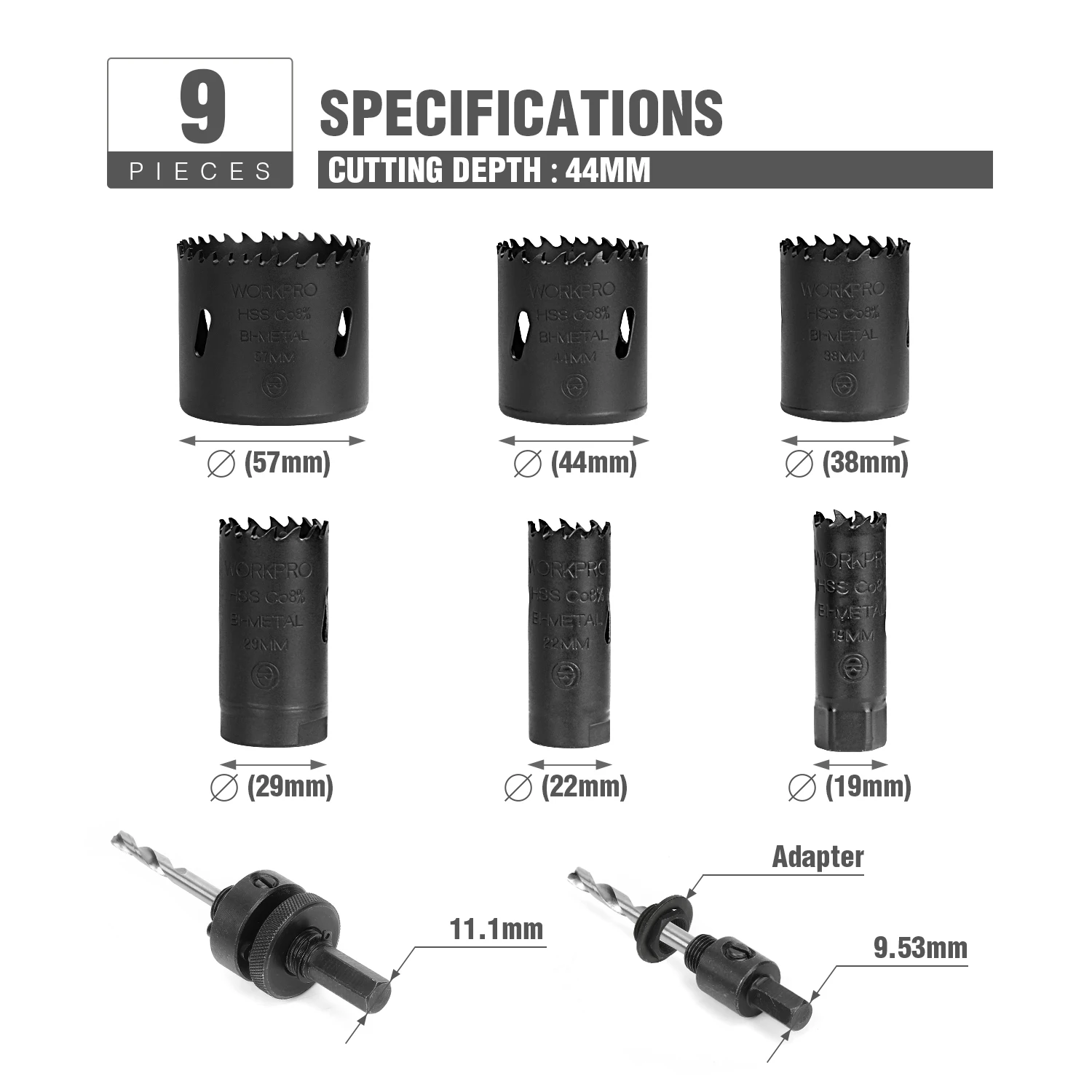 Набор корончатых сверл WORKPRO, комплект из 9 быстрорежущих твердос...