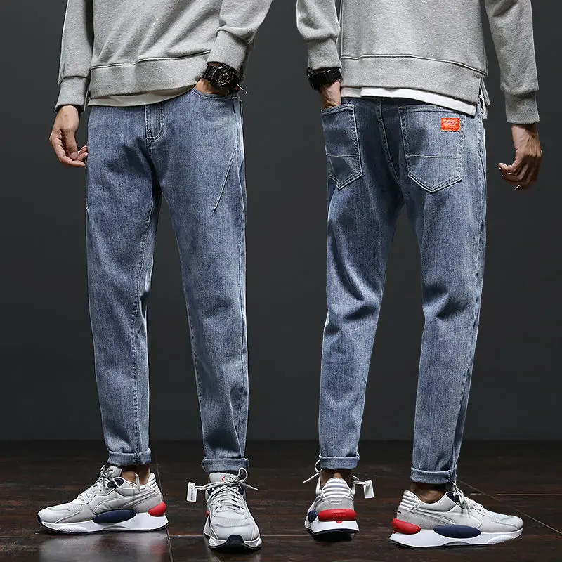 Новые осенне-зимние джинсы, мужские узкие Черные Узкие повседневные Прямые брюки с небольшими лапками, модные эластичные джинсы джокер с популярным логотипом
