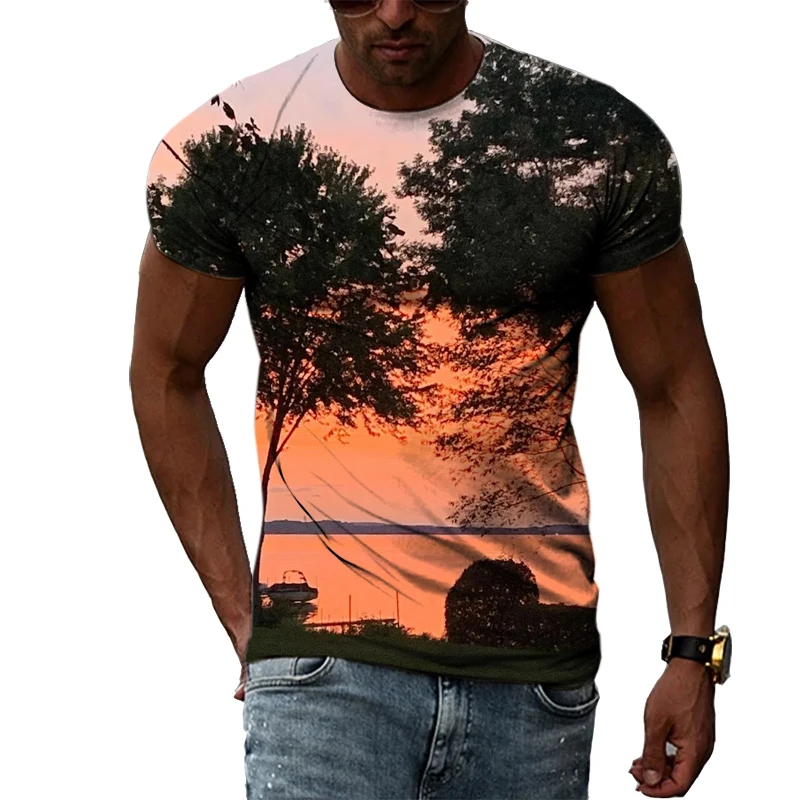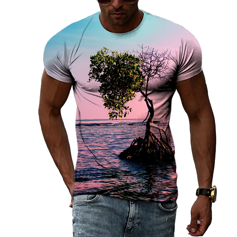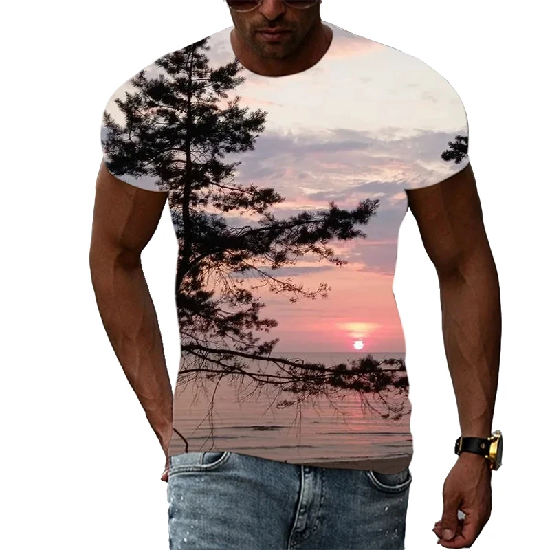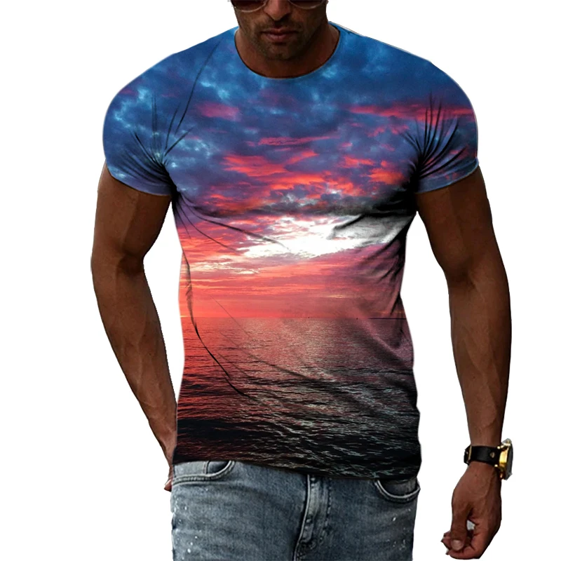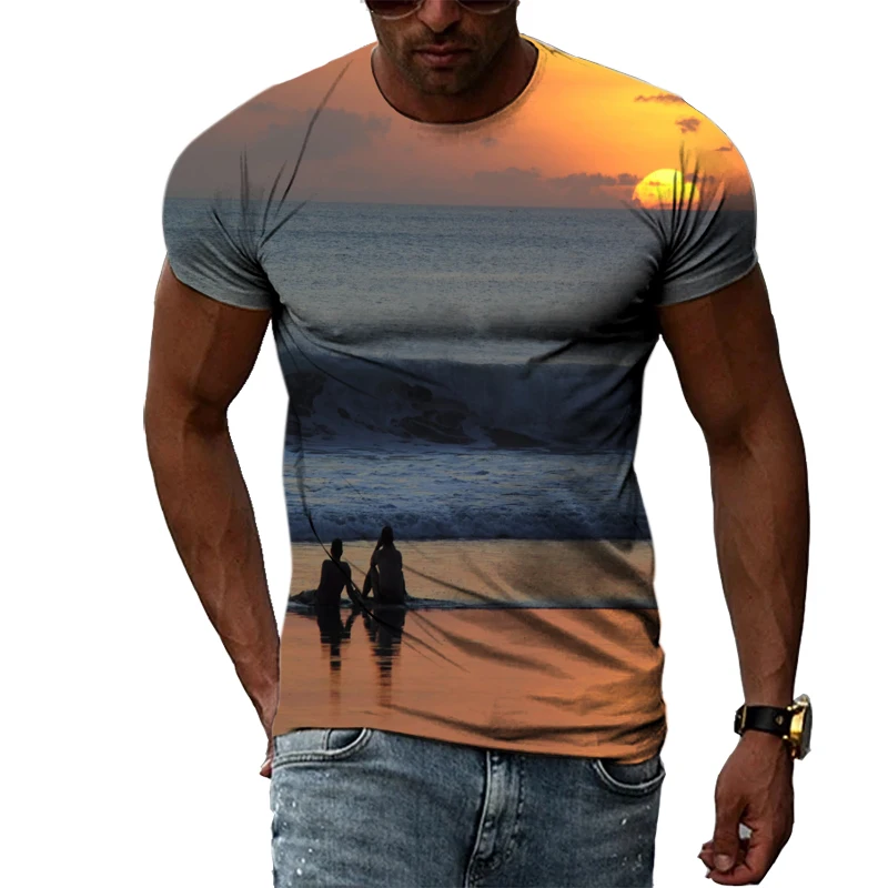 Новинка лета 2021, Мужская футболка с Естественным ландшафтом, 3D печать, вид на море, закат, повседневная Веселая модная уличная футболка с коротким рукавом, женская