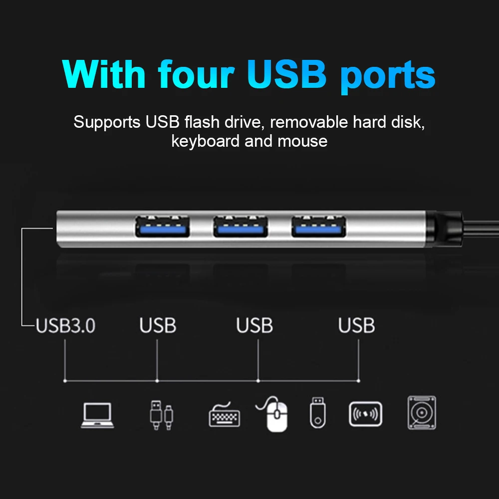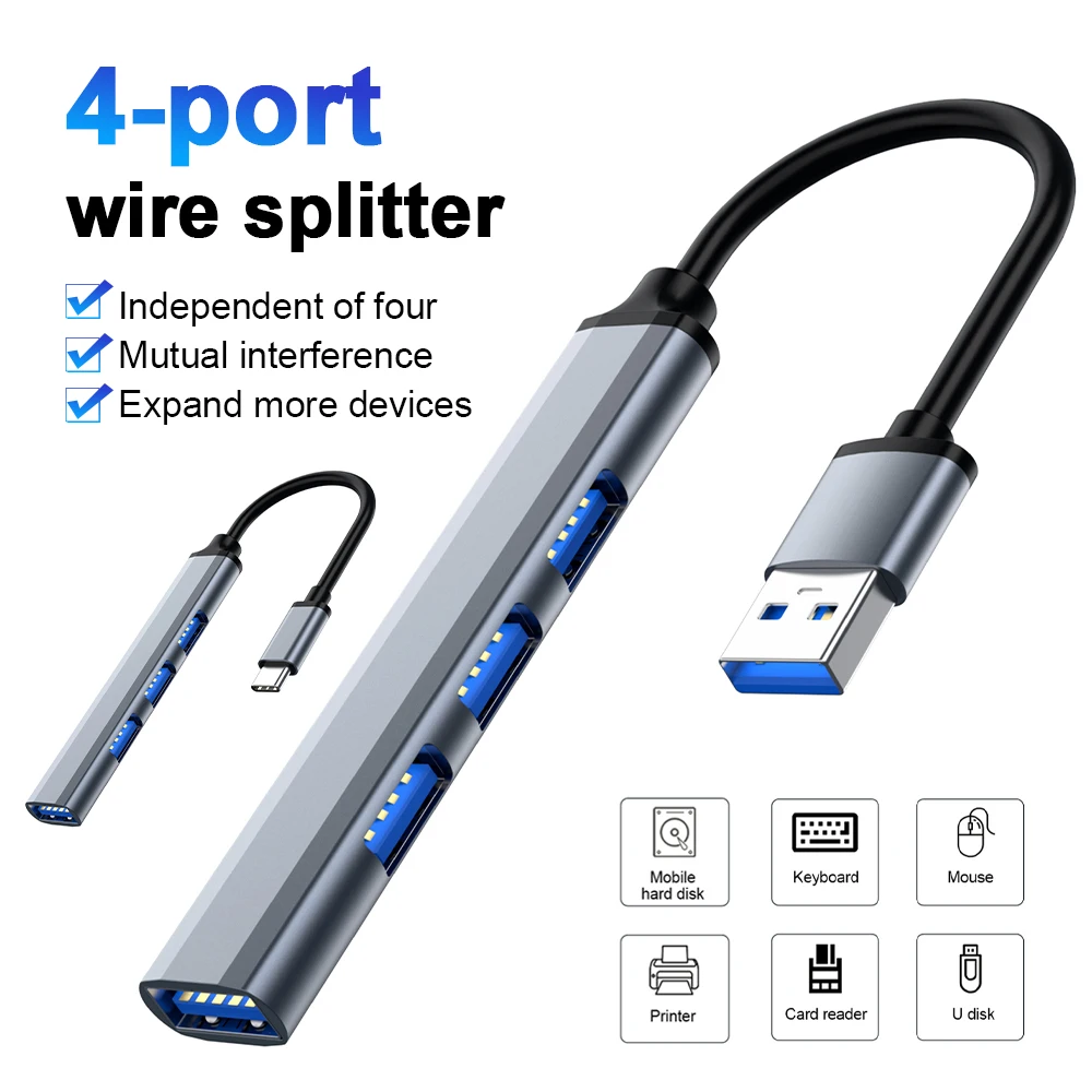 Сплиттер с 4 портами может быть подключен к клавиатуре, кардридеру, u-диску, мобильному жесткому диску, принтеру и т. д.
