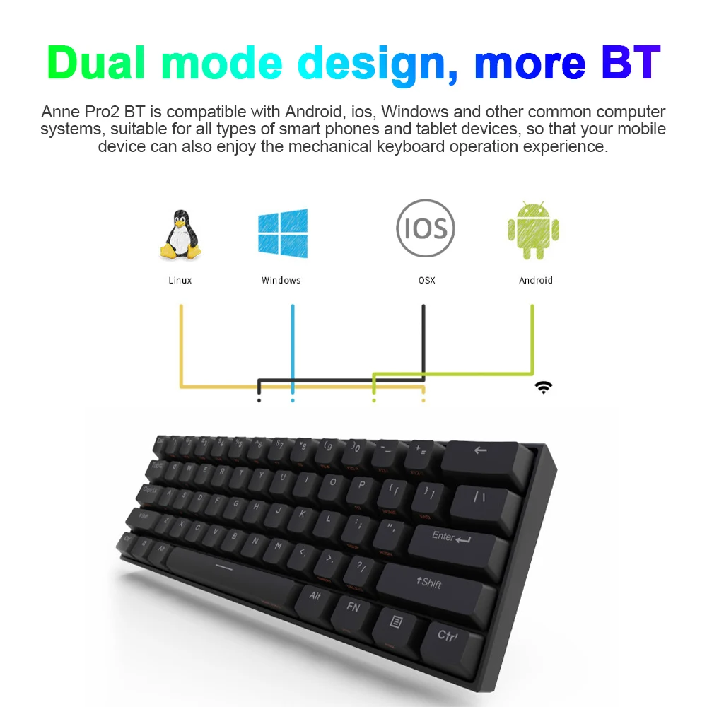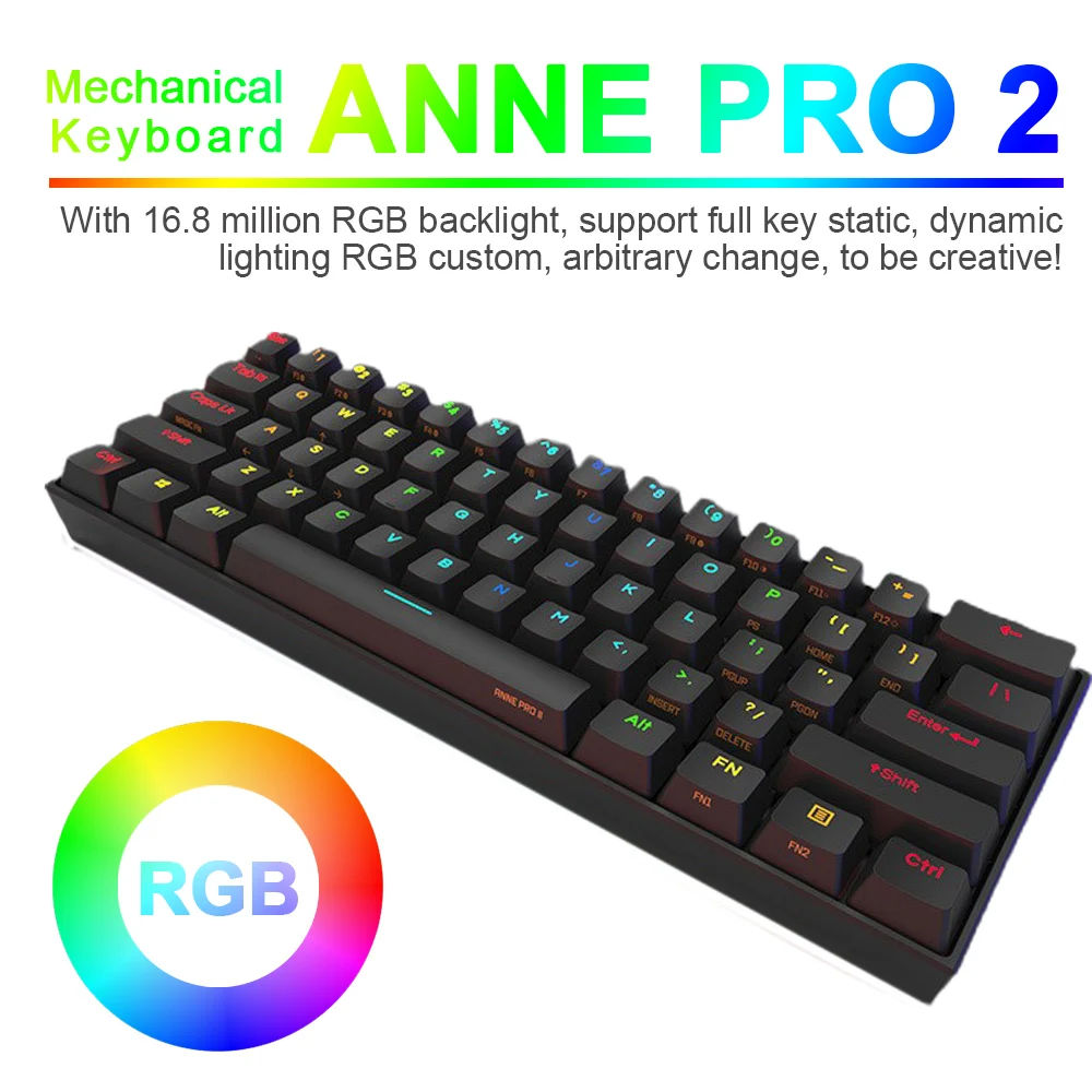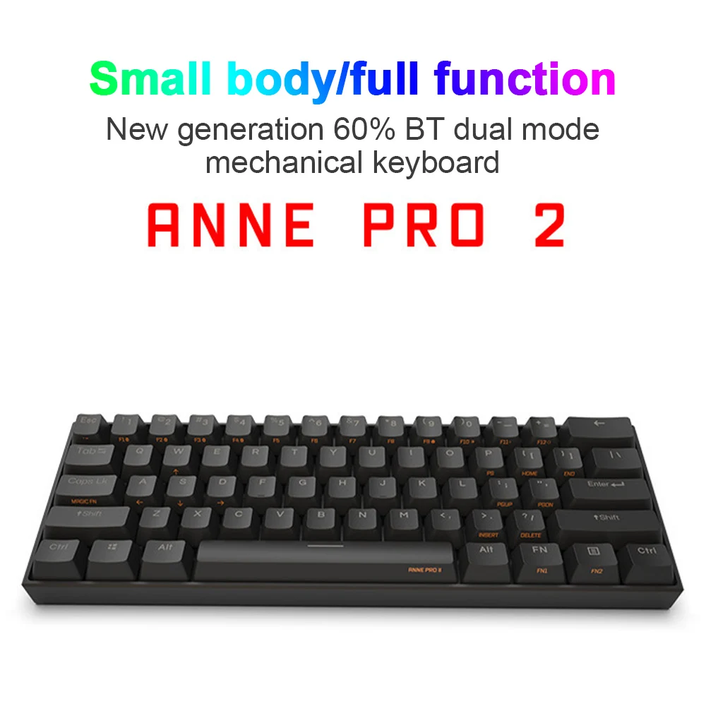 Беспроводная мини-клавиатура Anne Pro2 для игр, 60% портативная механическая клавиатура с Bluetooth, синийкоричневый переключатель Gatreon MX, отсоединяемый кабель