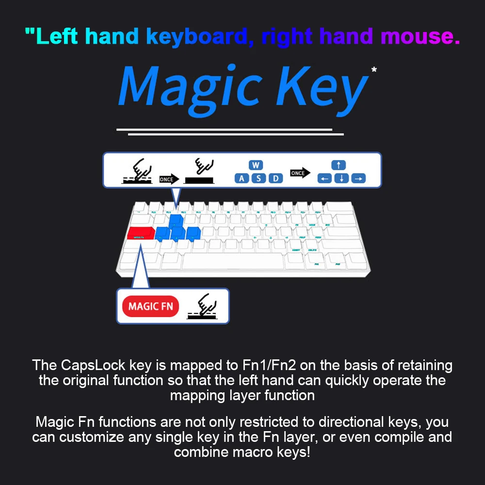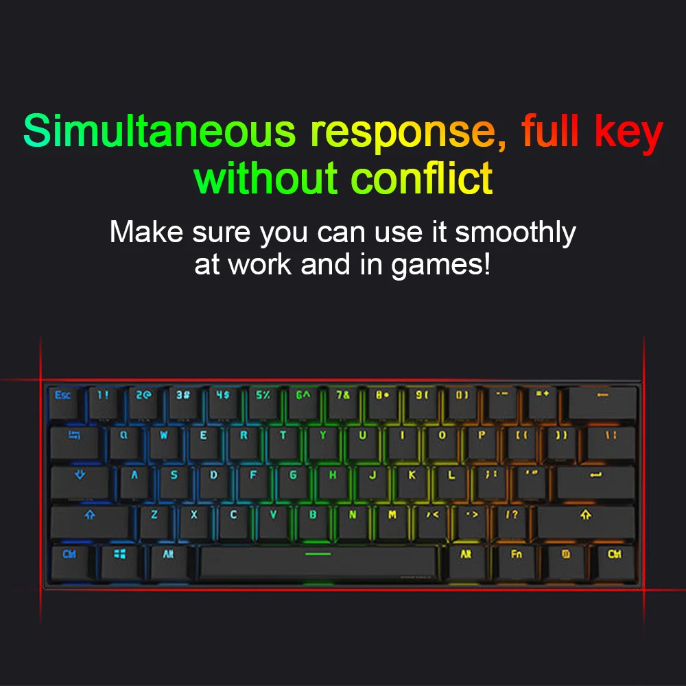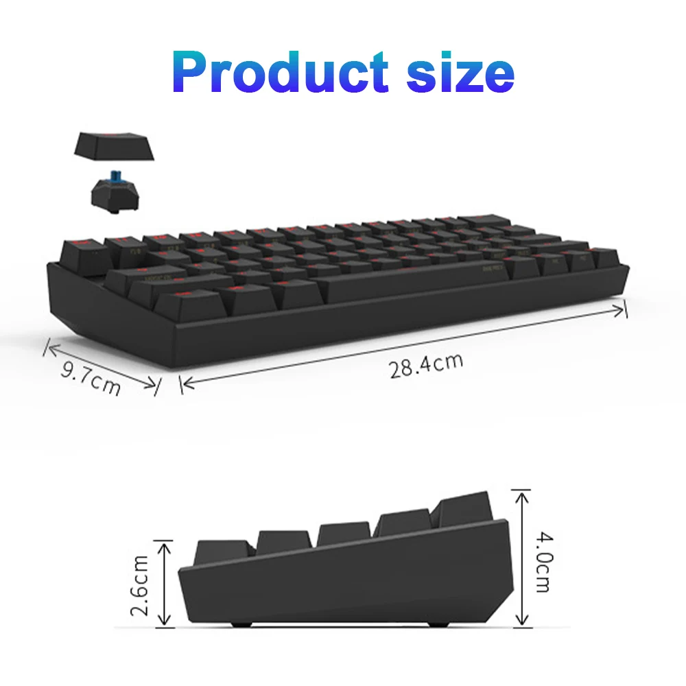 Описание:60% Проводная/Беспроводная механическая клавиатура 61 клавиша RGB с Подсветкой Bluetooth-совместимая игровая клавиатура 5,01. Двухрежимное Соединение: BT 4,0 и Type-C USB-C двухрежимное соединение делают его широко совместимым с различными системами, подходящими для Mac, iOS, Windows, Linux и Android.2. Двойной FN. Двойная кнопка FN (FN1/FN2). Интеллектуальная кнопка «светильник» и функции «magic FN».3. Крышка Ключа ABS. Двойные ABS колпачки долговечны.4. Полная RGB подсветка. Полная RGB подсветка, RGB подсветка может быть установлена независимо для каждой кнопки.5. Функция нажатия: Комбинация клавиш «Правый сдвиг», «FN1», «FN2» и «Правый Ctrl»-это клавиша нажатия, которая может быть установлена для нажатия функции слоя, И функция слоя будет срабатывать при нажатии кнопки TAP. По умолчанию они ведут себя как стрелки при нажатии.6. Большая Встроенная память для настройки. Все клавиши программируются, встроены в большую емкость встроенной памяти, используются для настройки функций TAP/Magic FN, настройки эффекта освещения, настройки раскладки клавиатуры и макронастройки.7. Функция Magic FN: сохраняя оригинальную функцию CapsLock, Magic Key может копировать функцию FN1 или FN2, позволяя вам быстро получить доступ к медиа. Это означает, что magic FN может служить связью FN. Вы можете установить функциональный слой для FN1/FN2, настроить любой ключ и даже создать Макрос для комбинации клавиш через стартер, и функция Magic FN может отражать это поведение FN.Характеристики:ТоварНазвание: Механическая игровая клавиатураЦвет: черныйМатериал: АБС-пластикПереключатель: Синий переключательРазмер: 284*97*40 ммИсточник: светильник SMDKeycap: ABS Двойной Выстрел Литья KeycapАккумулятор: встроенный литий-ионный аккумулятор 1900 мАчРабочий ток USB: 5 В постоянного тока, 500 мА максКабель: 1,8 м Тип-C USB Дата-кабельПоддержка системы: для Android,IOS,Linux, для Mac OS,Windows,Windows 10,Windows 2000,Windows 8,Windows 7Применение: Рабочий столПрименение: ноутбукСертификация: нетЯзык: английскийСтандарт клавиатуры: мини-клавиатураТип: Беспроводная связь с BluetoothСтиль работы: механическийСтиль: игрыСтиль: эргономикаСтиль: СтандартныйСтиль: эргономикаСтиль: мультимедиаСтиль: игрыСтиль: миниСтиль: многофункциональная клавиатураТип интерфейса: USBТип интерфейса: Совместим с BluetoothТип интерфейса: Bluetooth-совместимый/USBПолноразмерная Клавиатура: ДаПоддержка запястья: нетПереключатель: Синий переключательДругие: 60% механическая клавиатура, 60% Механическая игровая клавиатура, 60% Проводная Механическая клавиатура, 61 клавишная клавиатура, 61 клавишная механическая клавиатураПримечание:-Возможны небольшие погрешности в размере при ручном измерении.-Отклонение цвета может отличаться из-за различных настроек монитора, пожалуйста, поймите.