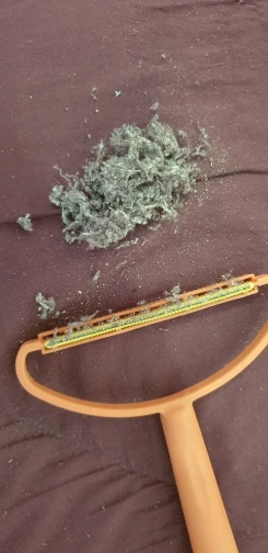 Металлическая сторона работает должным образом. Хотя это может повредить более мягкие ткани, такие как свитера, брюки и пальто, он хорошо работает на нашем диване. Сзади все еще остаются волосы собаки, но в целом они выглядят лучше, чем перед использованием средства для удаления волос.