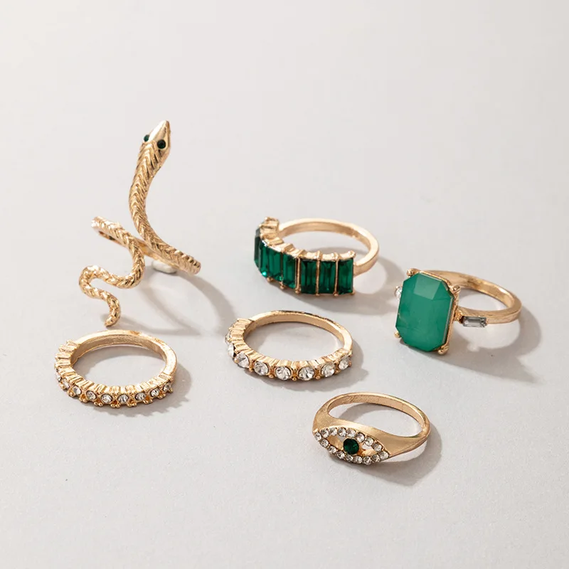 6 шт./партия креативный Зеленый Кристалл инкрустированное кольцо змея Ретро Золотой цвет металлический Циркон вечерние кольца для мужчин и женщин ювелирные изделия