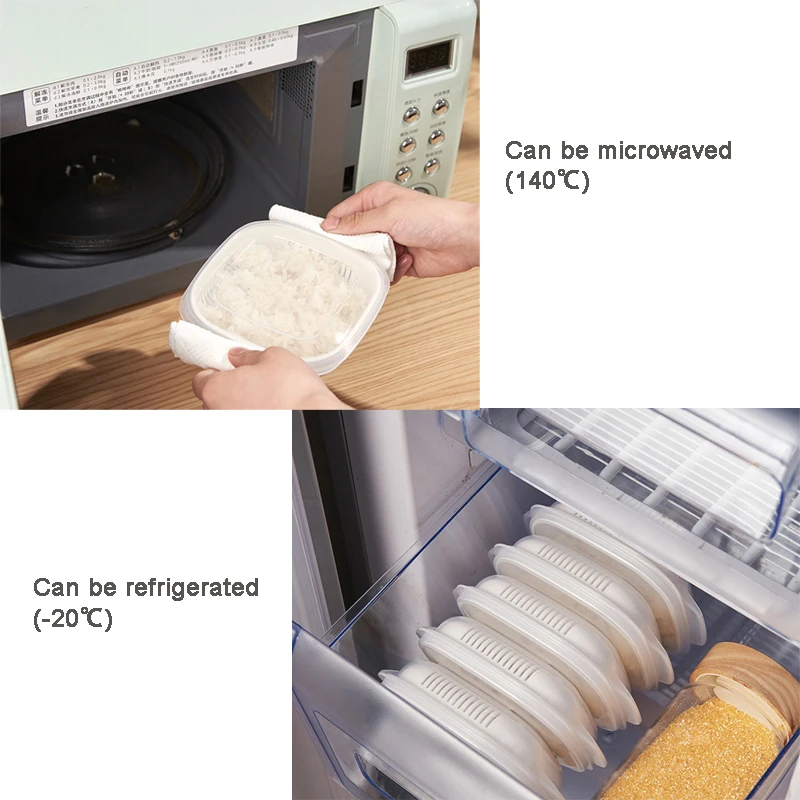 Встроенный паровой лоток: Когда микроволновая печь нагревается, она может способствовать циркуляции горячего воздуха в коробке, так что рис не легко промокает.