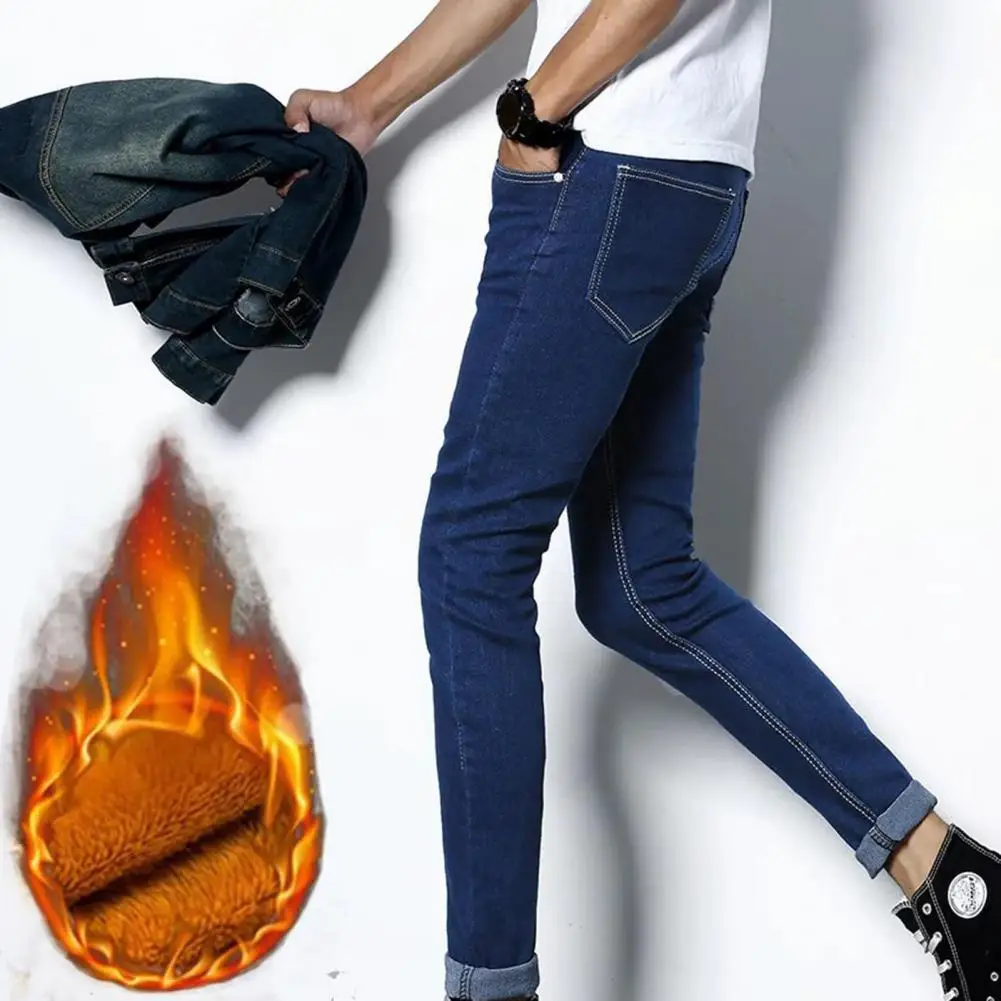 Джинсы мужские однотонные, теплые облегающие длинные брюки с плюшевой подкладкой, уличная одежда, зима 2021