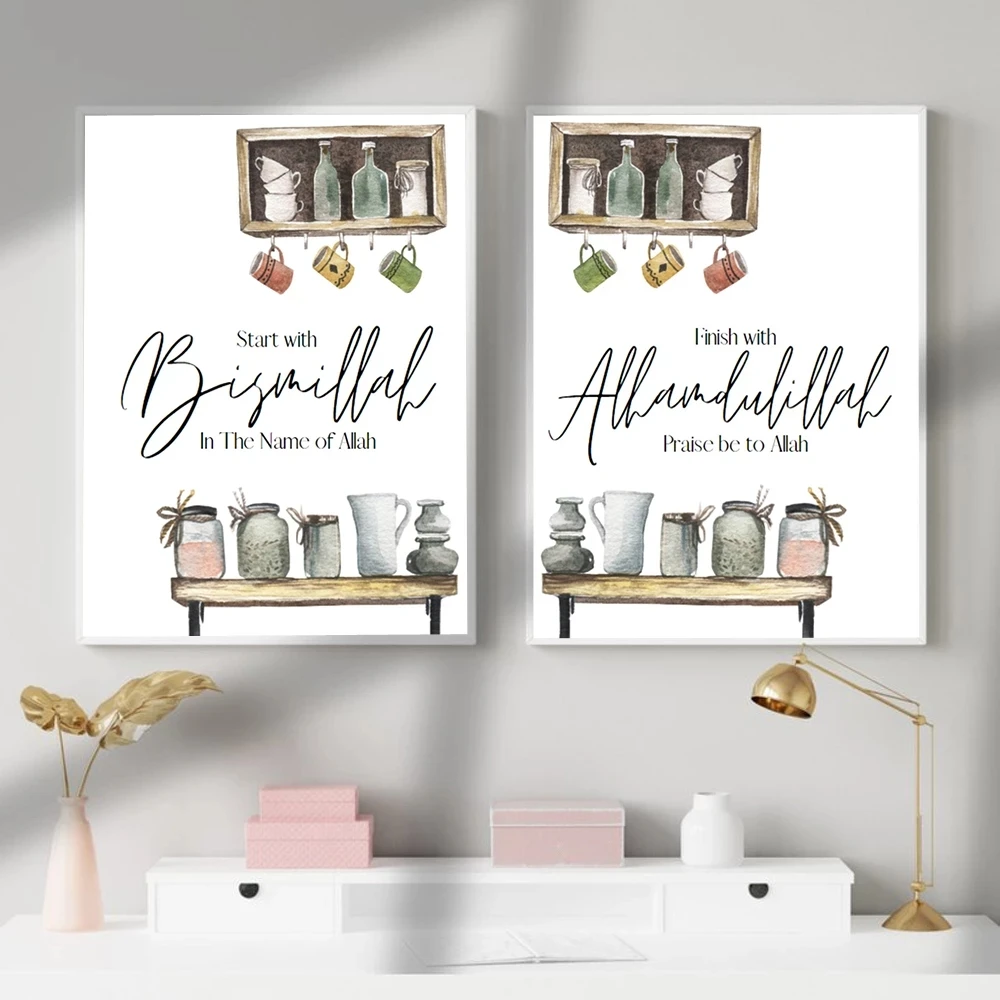 Исламские холщовые плакаты и принты, начиная с конца бисмиллы, с алхамдуллиллы, Арабская настенная Картина на холсте, картины, кухонный Декор