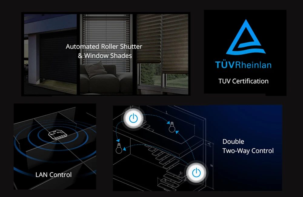 DualR3 Lite может работать как умный модуль управления для 100-240 В переменного тока двигателей. Как трубчатый двигатель, используемый в моторизованных занавесках, жалюзи, рольставнях, тентах и т. д.