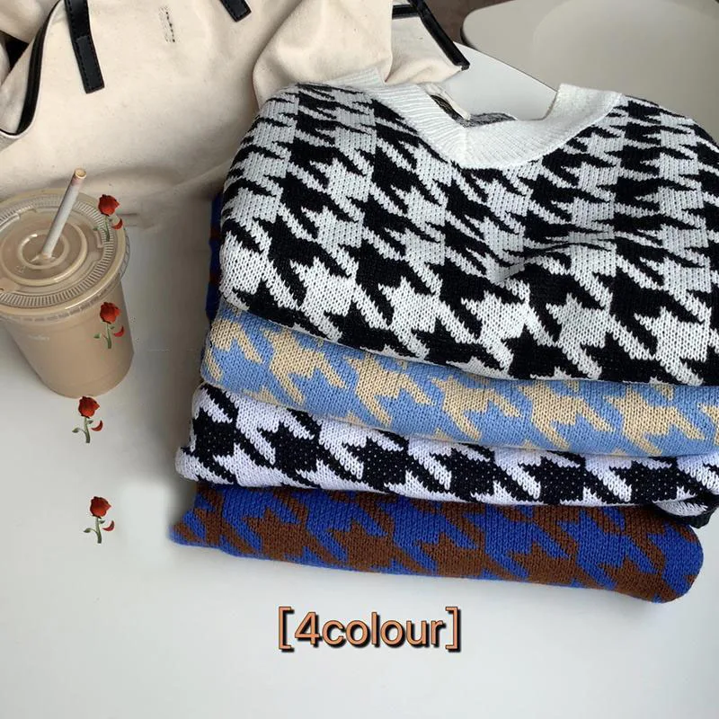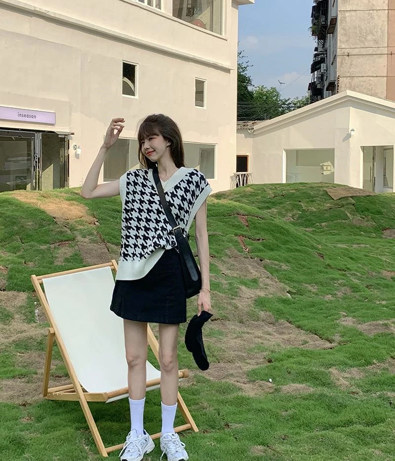 Женский свитер, жилет, Осенний клетчатый вязаный жилет в стиле гусиные лапки без рукавов с V-образным вырезом, винтажный свободный женский свитер, жилет, женская одежда