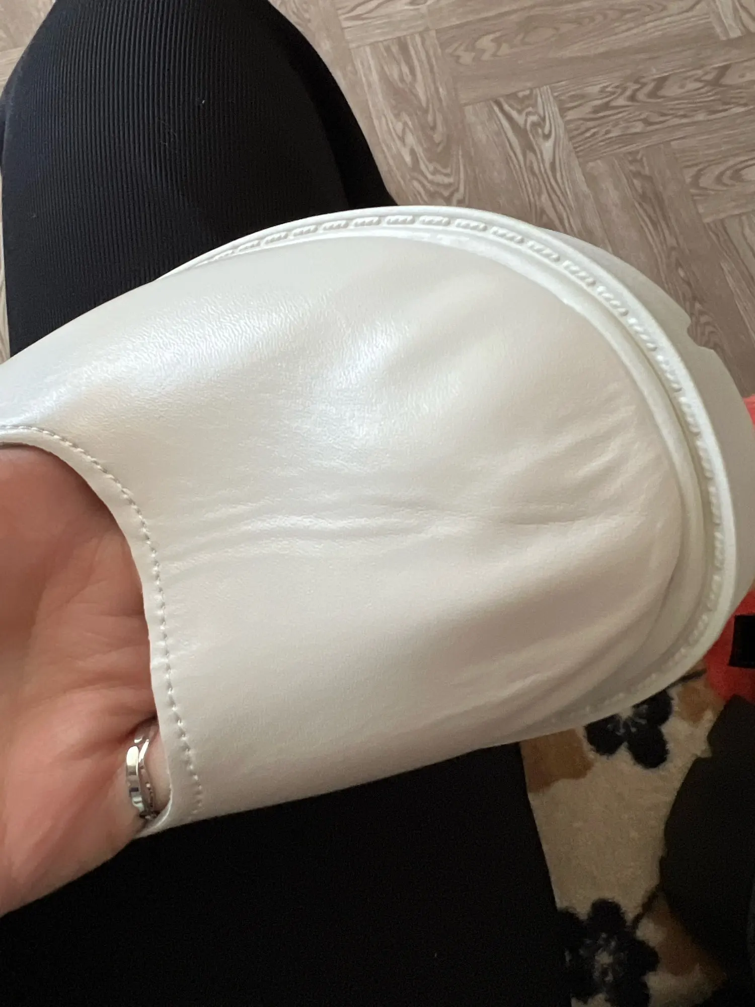 Товар пришёл в пакете, очень помялась обувь, советую продавцу что-нибудь подкладывать под них, на ноге смотрится красиво