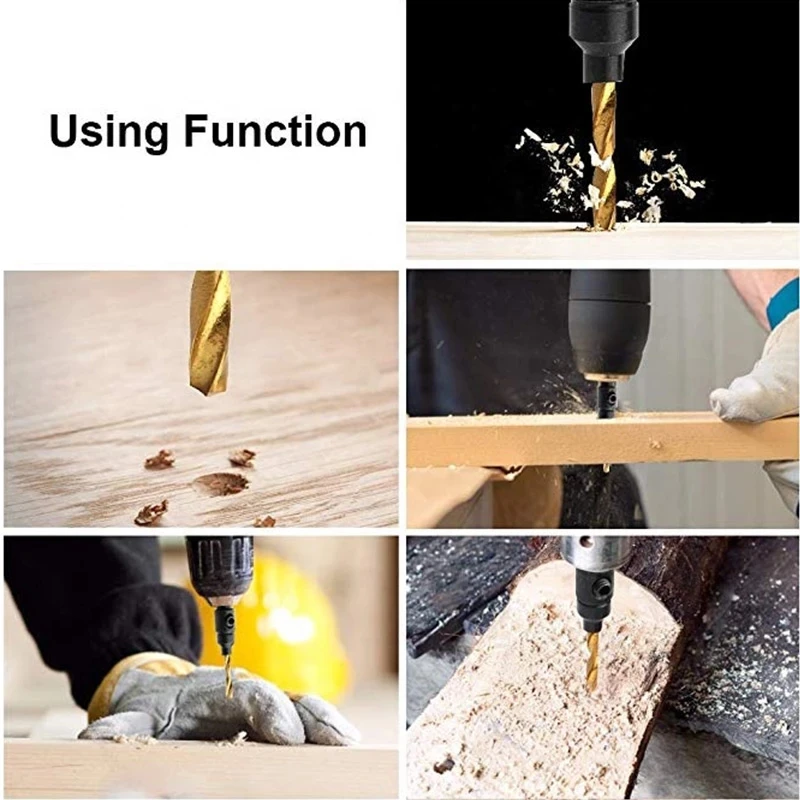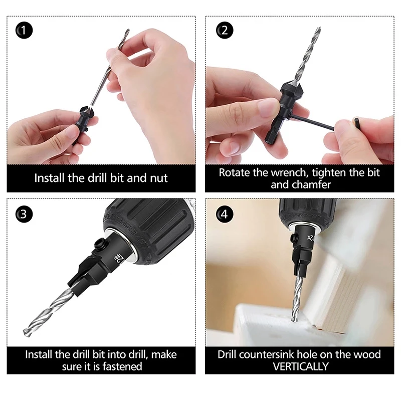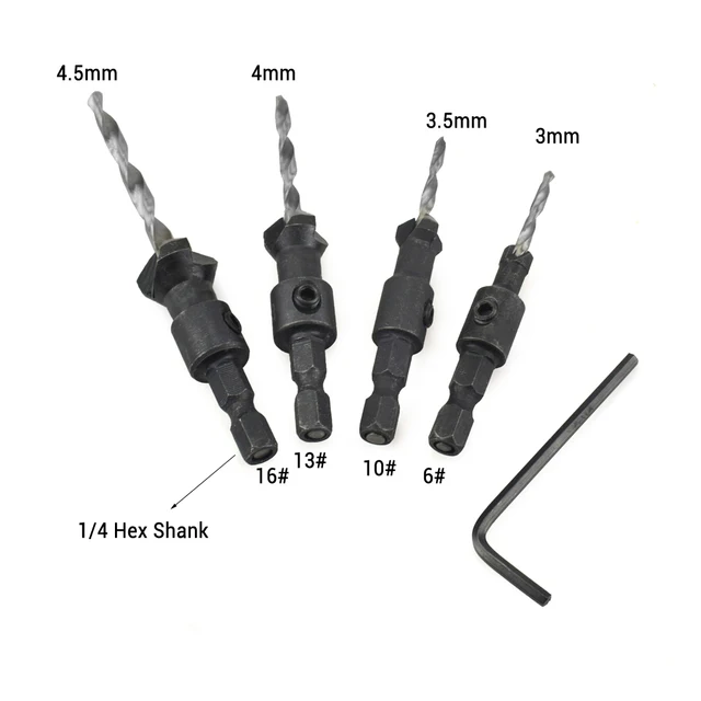 Описание:Сверление пилотных отверстий для винтаРазмер: #6,#10 ,#13,#16Специально разработанная стальная Столешница или столешница пилота отверстие.Регулируемая глубина рукава с шестигранным гаечным ключом.Стандартный шестигранный хвостовик совместим с быстрой заменой.Сверло и столешница для деревянных винтов без изменения бит.Длина сверления может быть отрегулирована для различных винтов длины просто путем ослабления и затягивания установочного винта. Характеристики:Цвет: как показано на фотографияхЧерный фаски сверла материал корпуса: сталь Посылка включает в себя:4 шт. x сверла с потайной раковиной