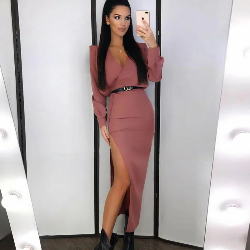 Сексуальное Белое платье Churses с V-образным вырезом и высоким разрезом, осенние элегантные вечерние платья-миди с длинным рукавом и высокой талией для ночного клуба для женщин 2021