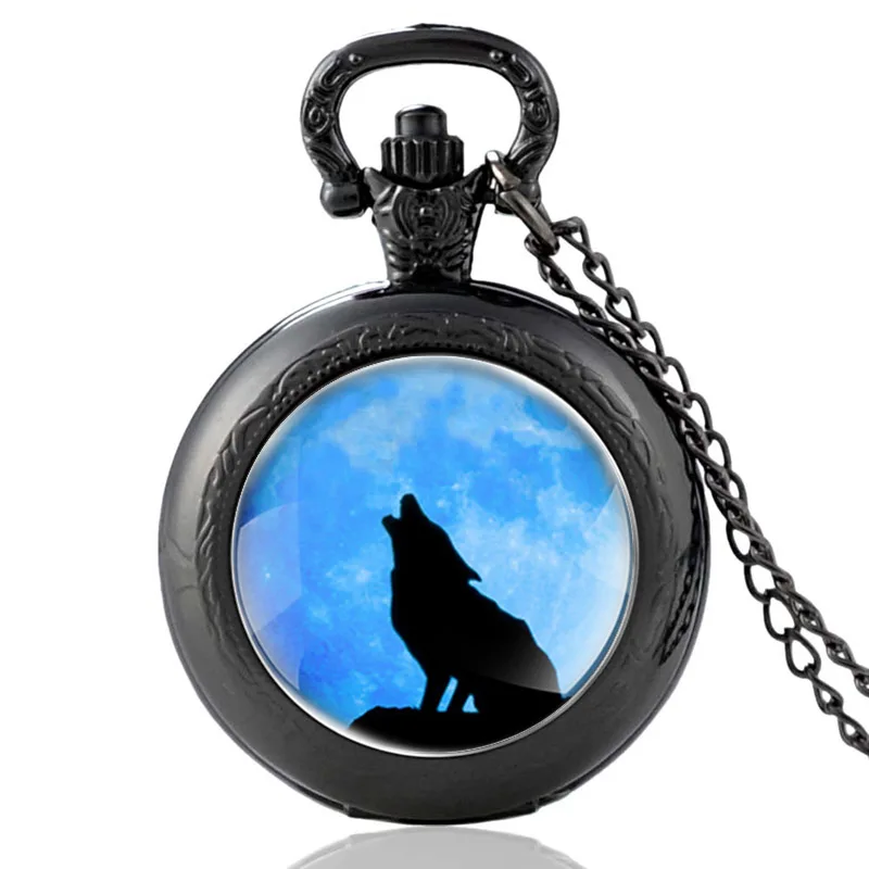 Черные классические кварцевые карманные часы с изображением волка под луной и кабошоном, антикварные мужские и женские часы с кулоном и ожерельем, подарки