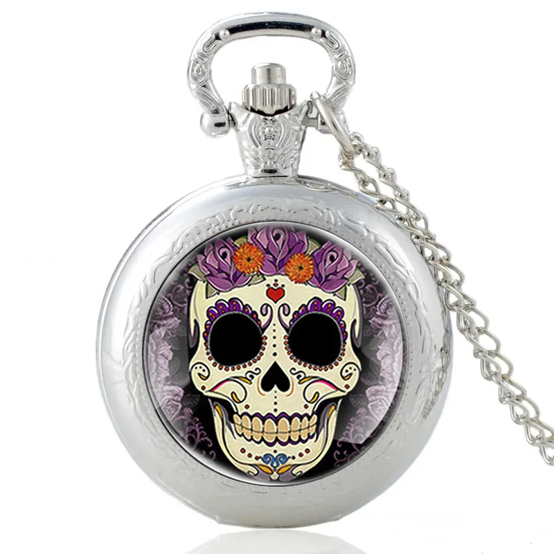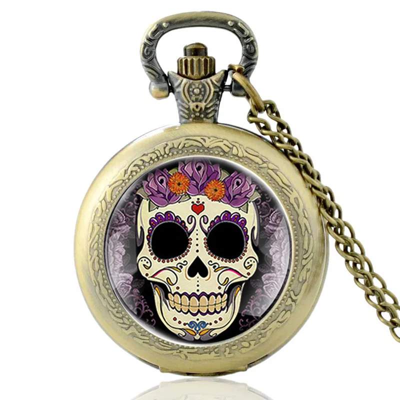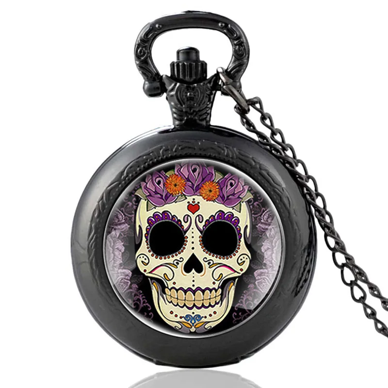 Черные классические кварцевые карманные часы в стиле панк с цветком, черепом, стеклом, кабошоном, антикварные мужские и женские часы с подвеской и ожерельем, подарки