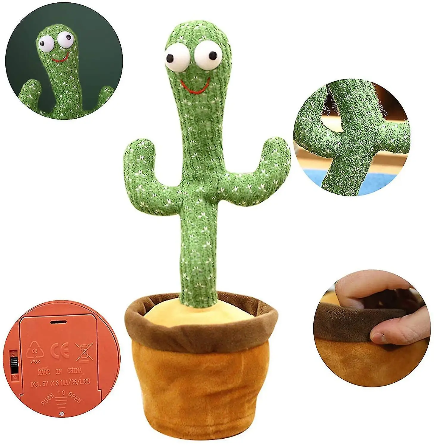 【 Высококачественный материал 】 танцевальный кактус использует нетоксичную и безвредную плюшевую ткань, ткань мягкая и удобная и не наносит никакого вреда.【Multifunctional】 может спеть; Может записывать; Учится говорить; Будет светить; Может танцевать. Содержит 120 различных песен, он будет переключаться последовательно в соответствии со встроенным списком песен. Каждый раз, когда он поет, и его тело также будет качаться с мигающими огнями, что очень интересно. Слегка нажмите зеленую кнопку и поговорите с ним, он будет использовать свой уникальный голос, чтобы узнать от вас. Нажмите Зеленую кнопку в течение 3 секунд и поговорите с ним, он будет записывать ваш голос, и вы можете слушать его повторно.【Легко использовать 】вставьте батарею и включите питание, нажмите красную кнопку, плюшевая игрушка кактуса будет качаться и спеть веселые песни. Питание от аккумулятора; Требуется 3 батарейки AA (не входят в комплект).[Милый подарок] плюшевые игрушки кактуса-лучший праздник и подарки на день рождения. Веселая музыка и танцы очень подходят для создания приятной атмосферы и подходят для посиделок.[Примечание] голос пения не ясен; Он продолжает наклоняться от одного до пяти песен; Время песни сокращено и т. д. если вы столкнулись с этими проблемами, пожалуйста, не волнуйтесь! Это может быть вызвано недостаточной мощностью аккумулятора. Пожалуйста, попробуйте новый аккумулятор!